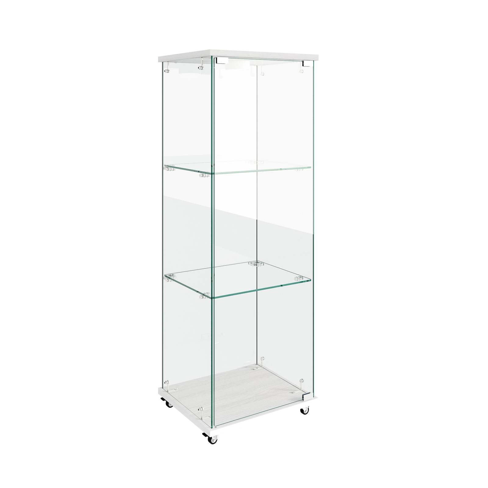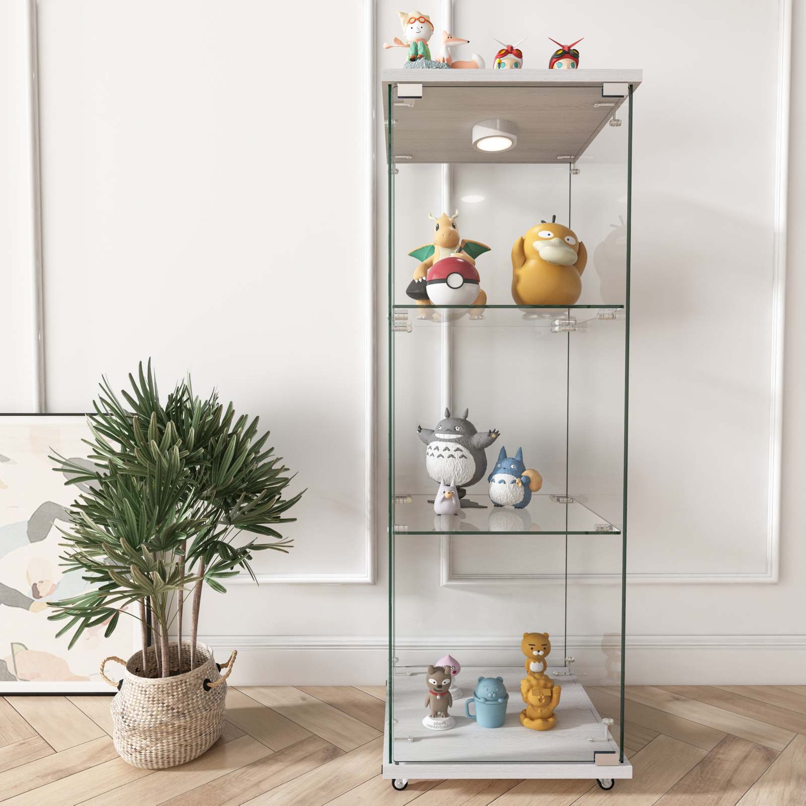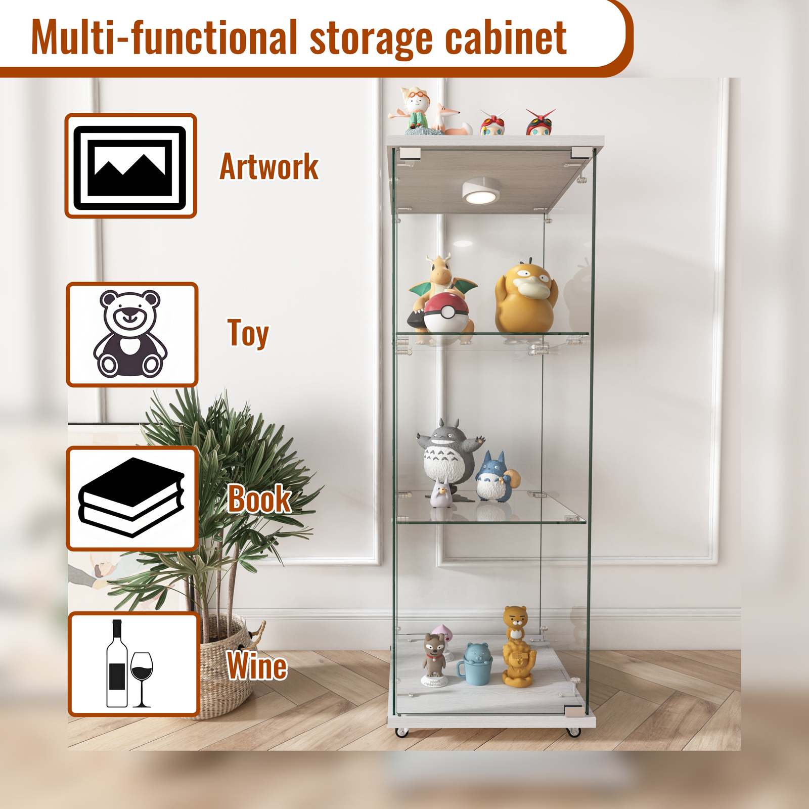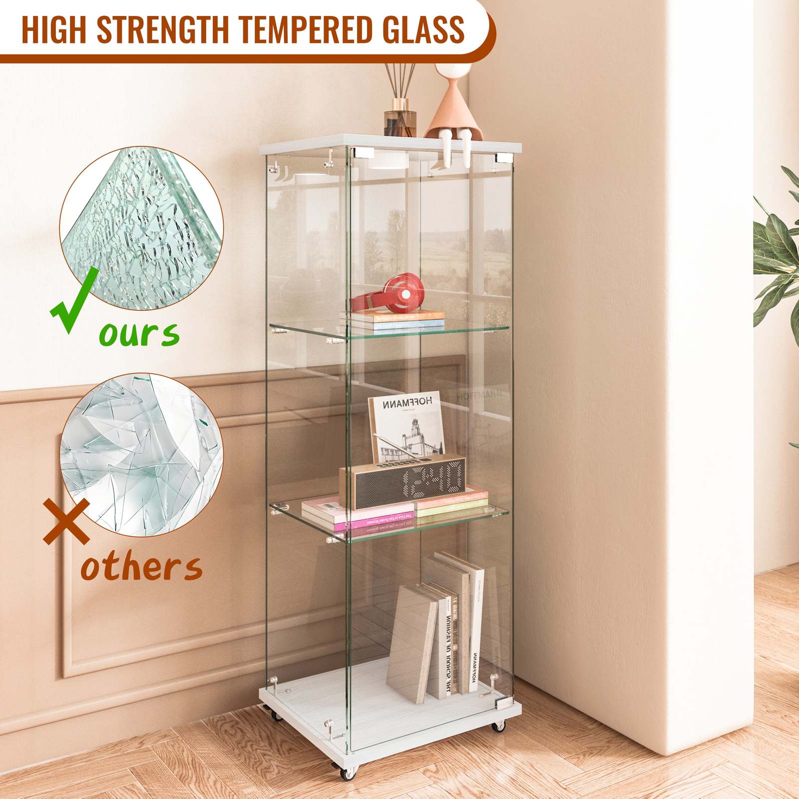 1.Glass Display Cabinet: Size 47.91'(H) x 16.73'(L) x 14.37'(W) inches, each tempered glass is 5mm thick. The 3-layer shelf is designed to be sturdy and stylish. The glass doors are easy to open and close. It is equipped with 4 caster wheels with brakes.