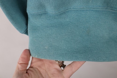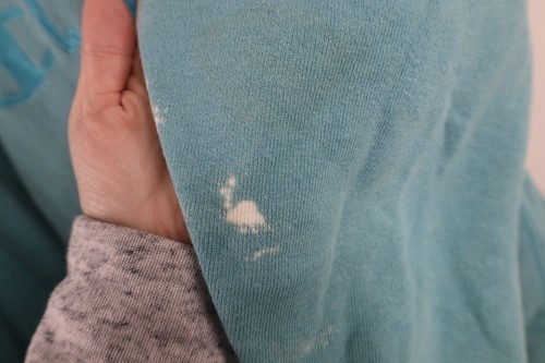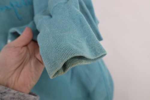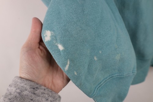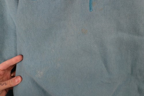 Blemishes front, sleeves, and collar. Color fade. Made in USA