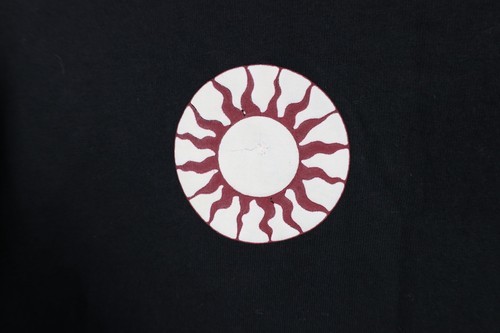 Blemish front bottom. Hole back bottom. Color fade. Graphics distressed.
