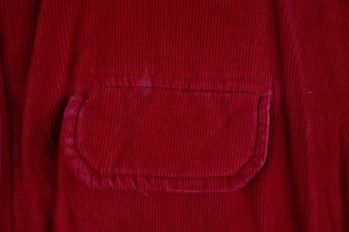 Hole, blemishes back top. Stain front top pocket. Loose threads pockets, inner lining. Color faded. Pilling. Inner lining blemished