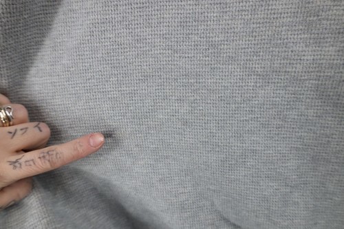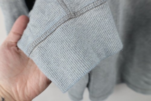 Dark spots front. Collar, arms, cuffs, near buttons discolored. Collar stretched. Color faded. Pilling