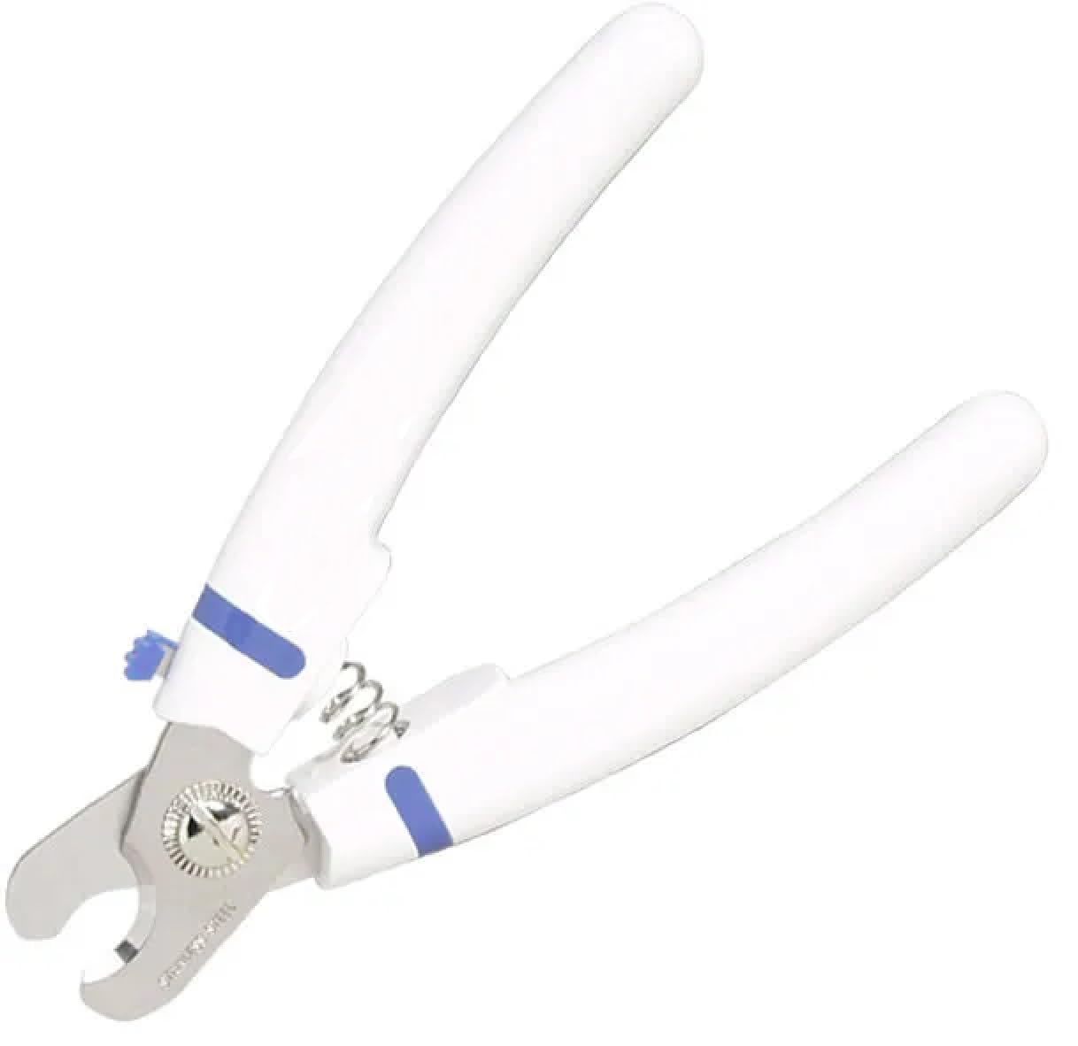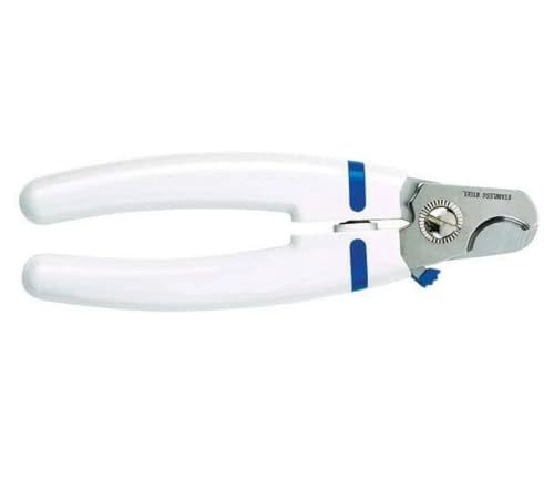 Product description: These durable plier style Pet Nail Clippers are a must-have for every pro or at home groomer. These clippers are quality made of stainless steel to stand up to years of use. Comfortable grips and a spring-loaded mechanism for more positive cutting action. Lightweight clippers feature heavy duty stainless steel blades. Injection molded plastic handles. Two different sizes make more effective clipping on all size dogs. Lock allows you to store the blades in the closed position. These are pro level clippers, with a distinctive, designer style white with blue stripe design. Material: Stainless steel blades; Injection-molded plastic handles Available in 5" Small, 7" Large or a Groomer's Set of Both Sizes.
