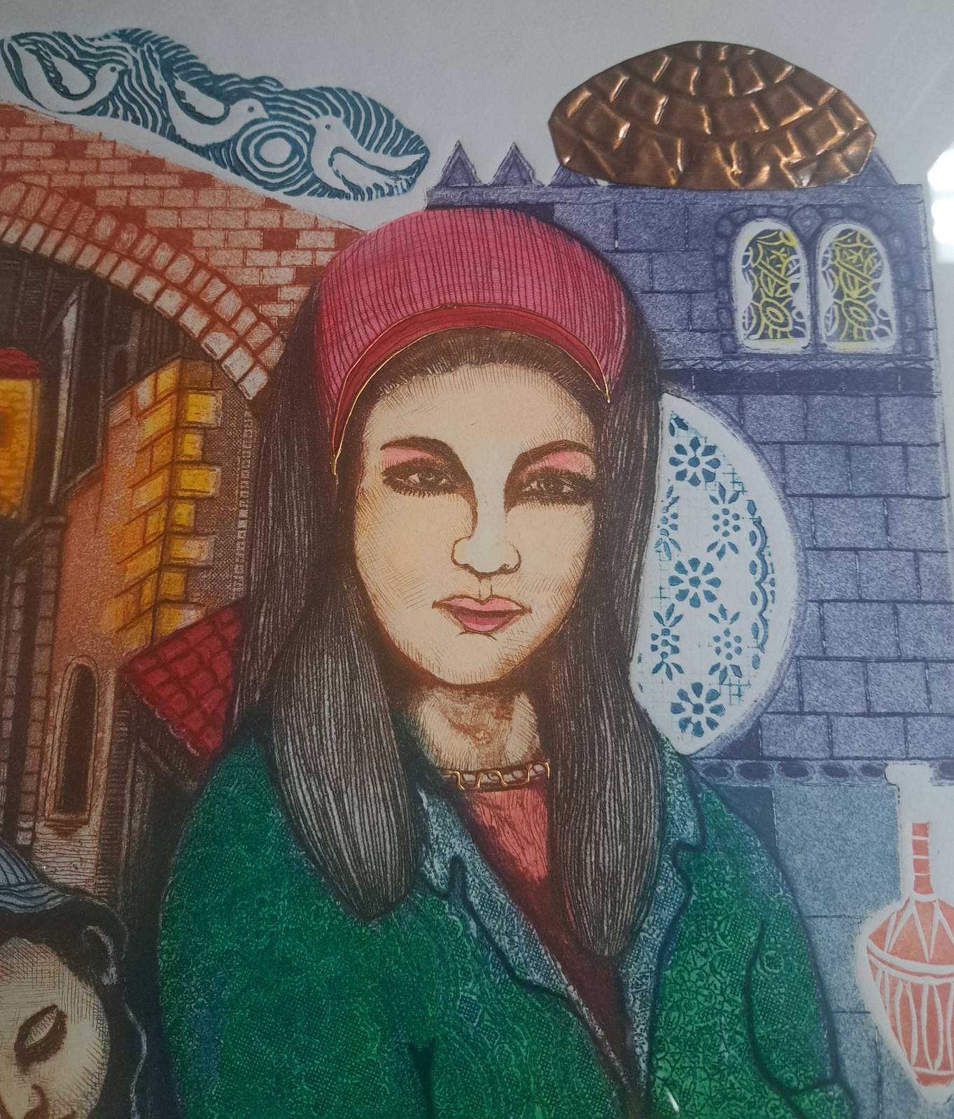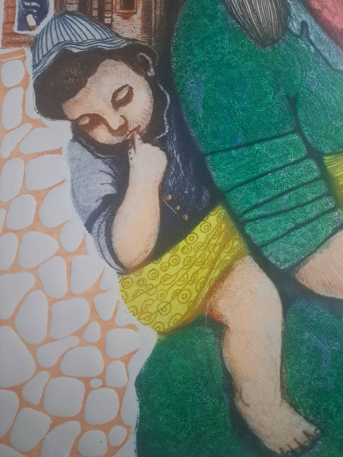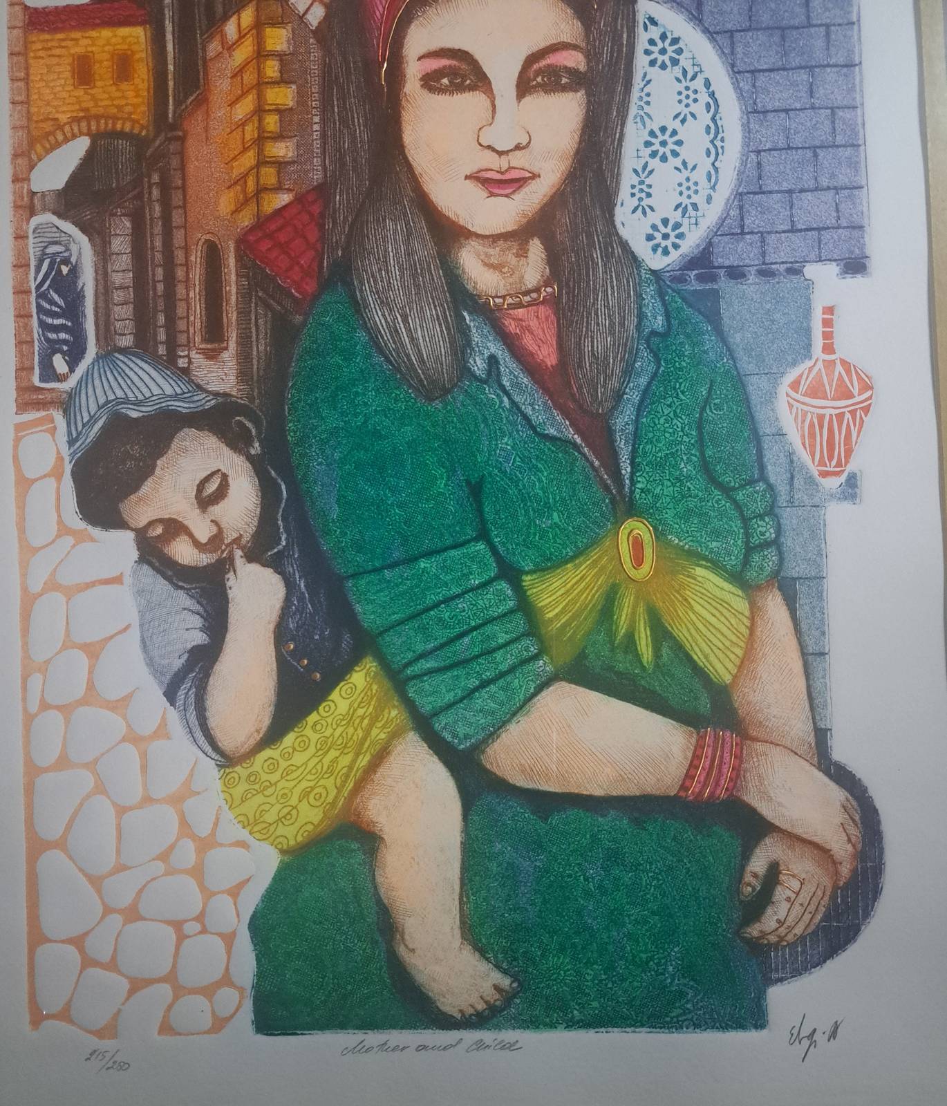 TITLED "Mother and Child " HAND COLORED ETCHING, FOIL EMBOSSED, JUDAICA ART BY THE REKNOWN ARTIST AMRAM EBGI# 558/900