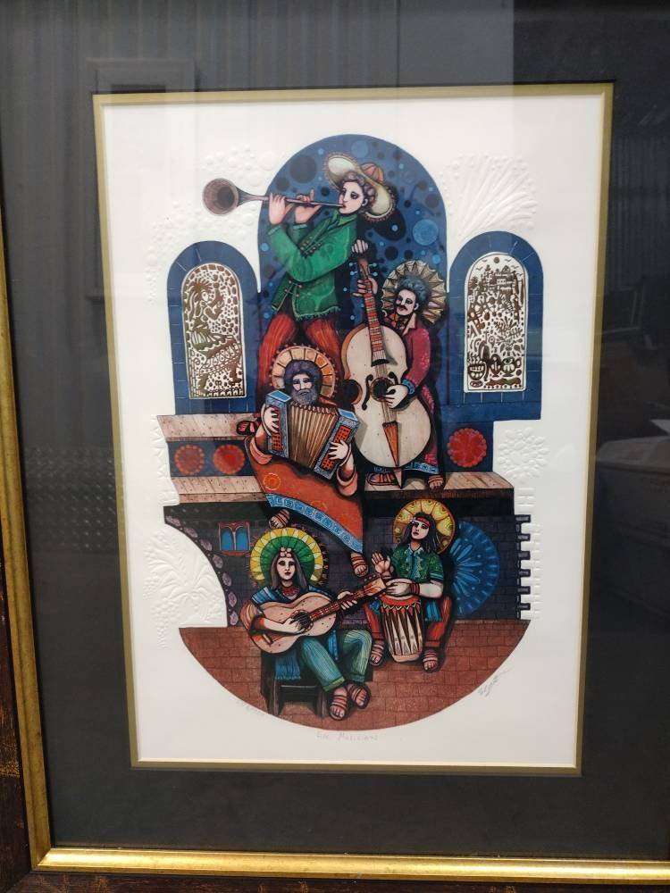 UP FOR YOUR CONSIDERATION IS THIS LIMITED EDITION 558/900 S/N EMBOSSED COLOR LITHOGRAPH, LIMITED EDITION, HAND SIGNED IN PENCIL BY THE ARTIST. TITLED "5 MUSICIANS" HAND COLORED ETCHING, FOIL EMBOSSED, JUDAICA ART BY THE REKNOWN ARTIST AMRAM EBG# 558/900