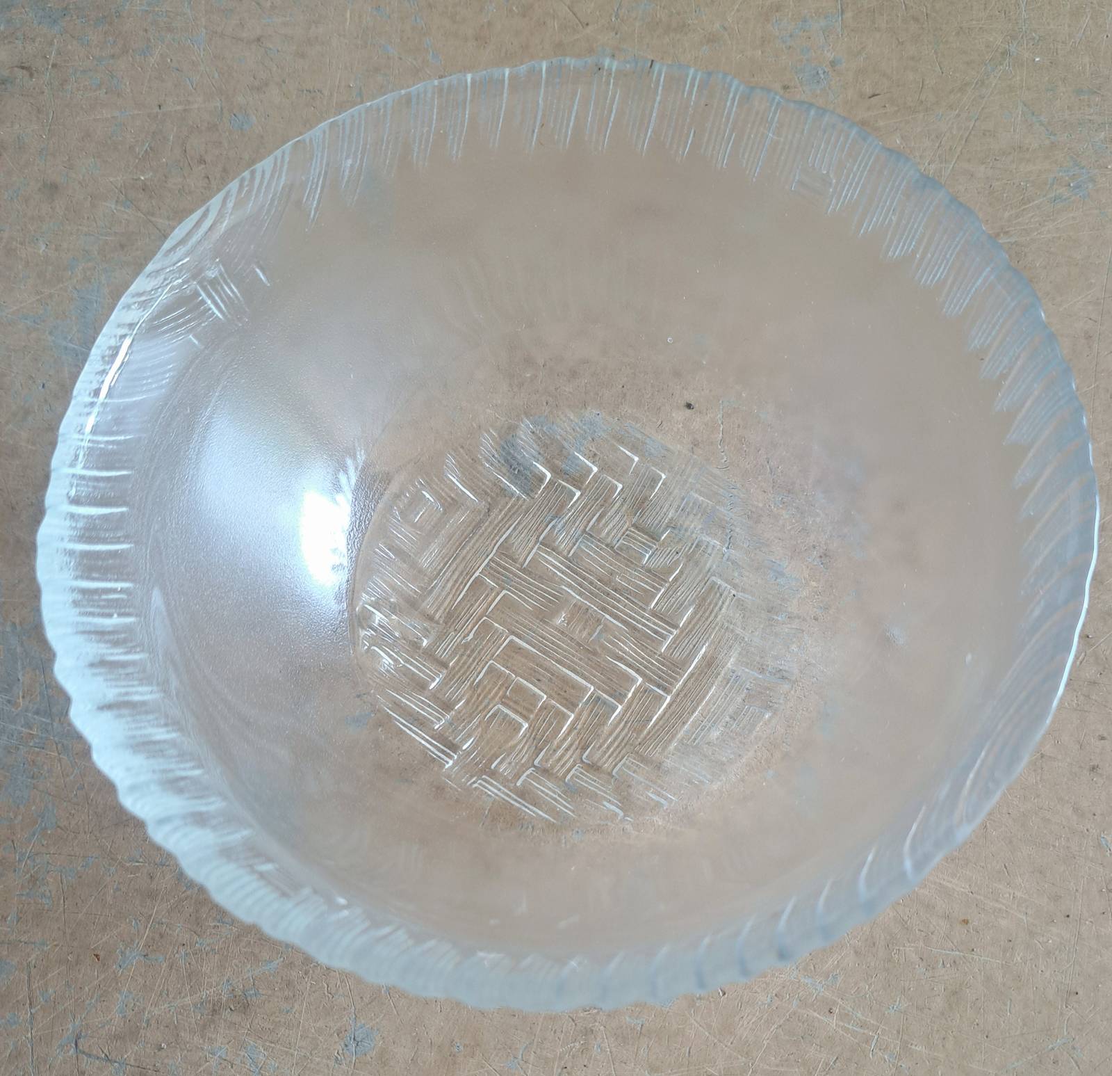 This ARCOROC clear glass bowl is pressed glass in the fiesta design in the bowl.