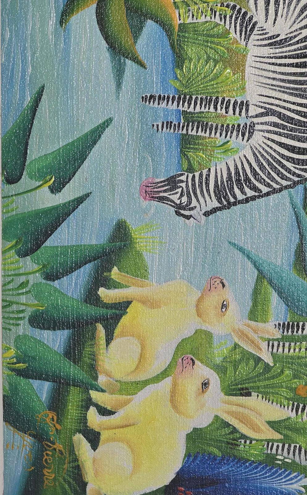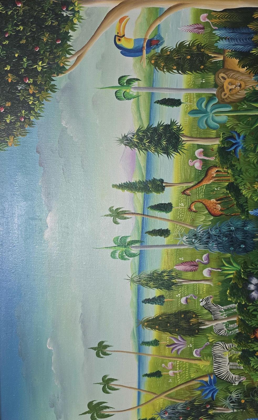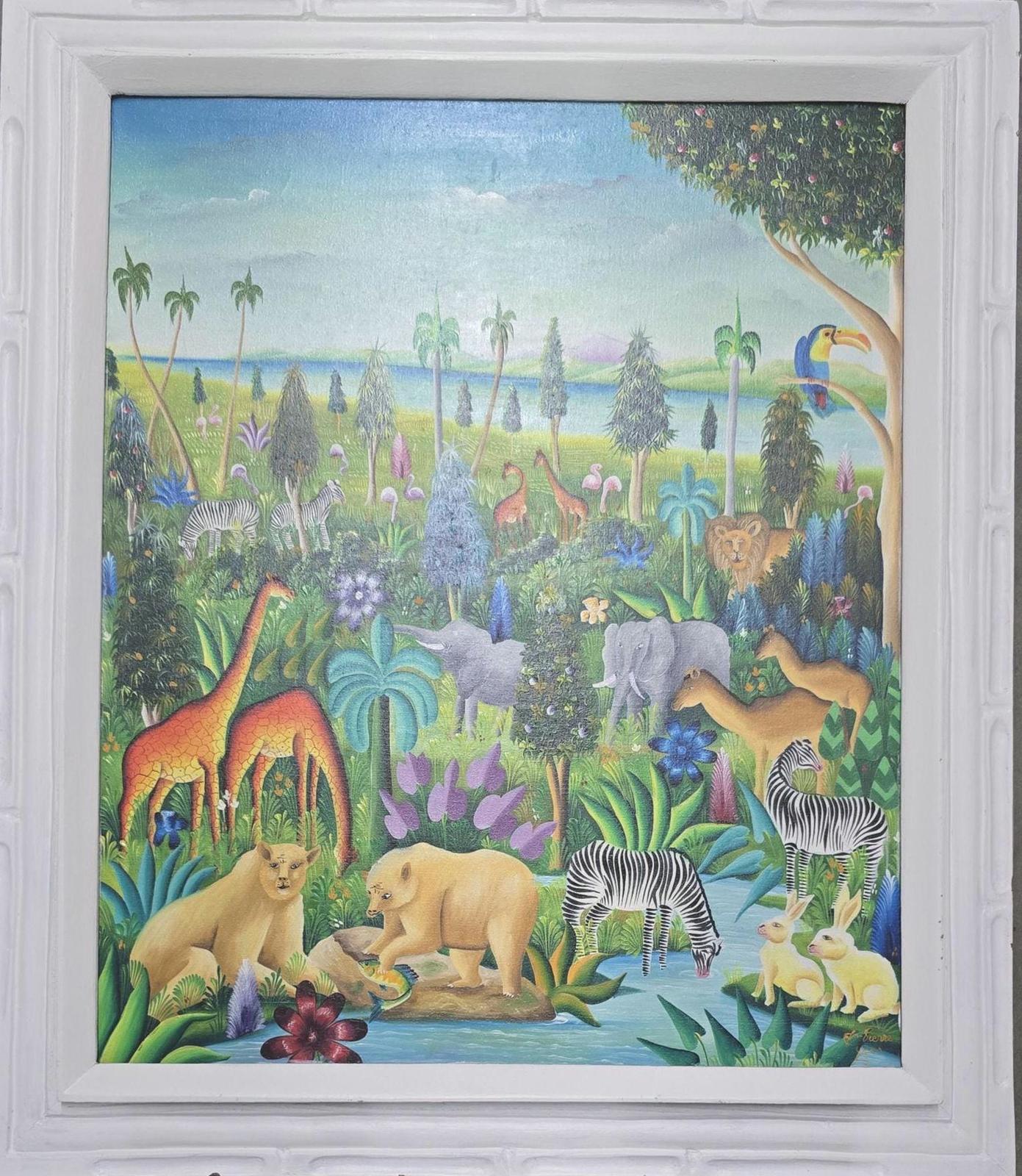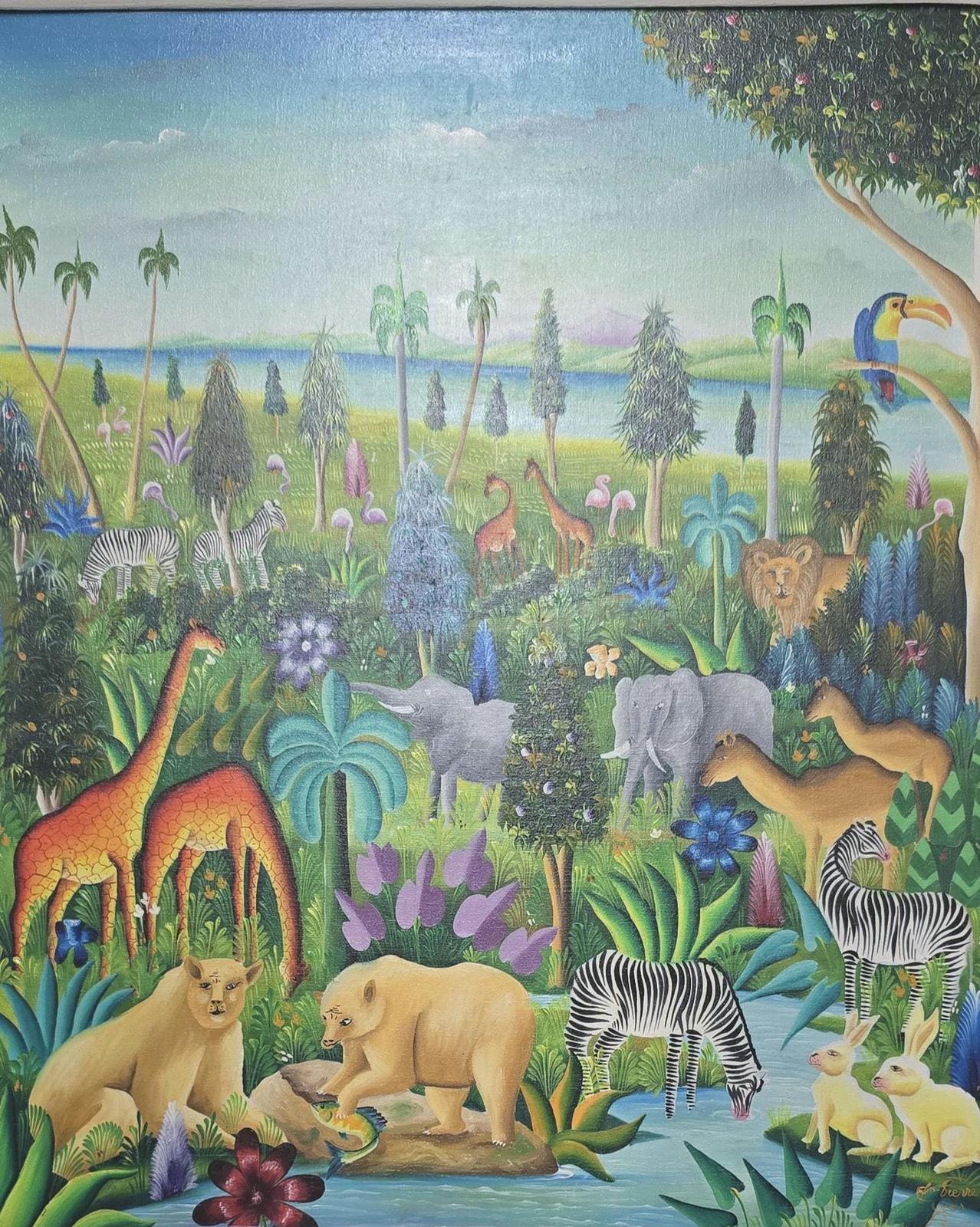 Signed Yves Jean Pierre Naif Folk Art Jungle Animal Oil Painting Haiti
