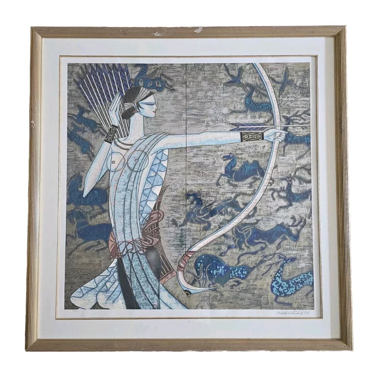 Considered a leader of the Chinese art movement known as the Yunnan School, Ting Shao Kuang creates exotic figurative paintings and serigraphs that combine eastern and western aesthetics. Using strong jewel tone color and erotic female imagery, the artist merges the ideological and traditional forms of Egyptian art with the more decorative and risque elements of Art Nouveau.