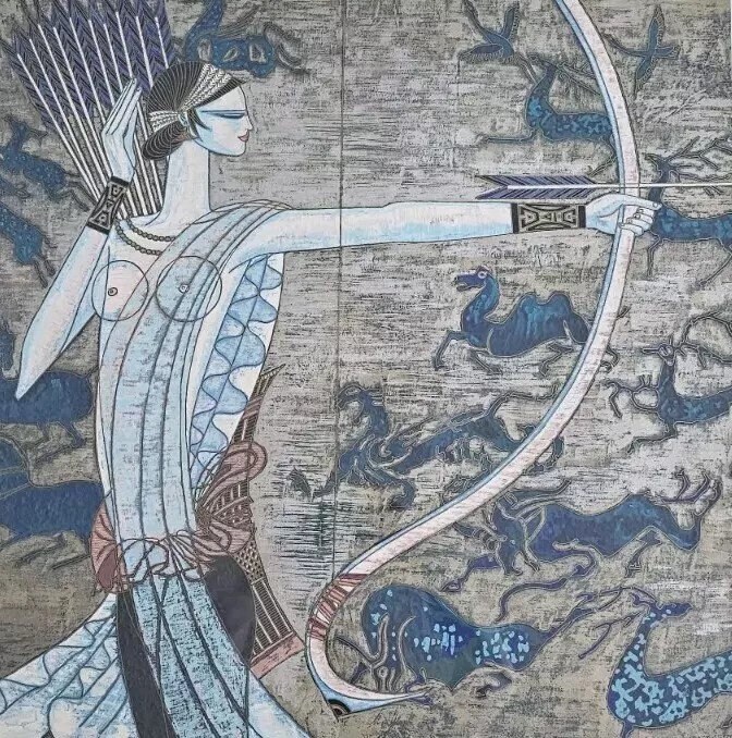 Instead, he began to use his previous training and exposure to western art to create a new style that fused elements of Western art such as Cubism and Art Nouveau with more primitive forms like Egyptian art and the area?s numerous cave paintings. He was also inspired by the Yunnan region?s lush color and diverse ethnic and religious culture as he incorporated traditional symbolism and customs. Ting?s purposeful marriage of ancient art customs, masterful brush strokes, and calligraphic lines, mixed with the starkness and beauty of modernism, have made his works some of the most recognizable in the world. He is considered a world-renowned leader of the Yunnan School by the American art critic Douglas Finly. Japanese art critic Murobushi thinks him an exceptionally authentic Chinese artist, and French art critic Andre Parinaud once commented that ?His art has a timeless exuberance, and its exultation of love has turned him into a 20th century Giotto.?