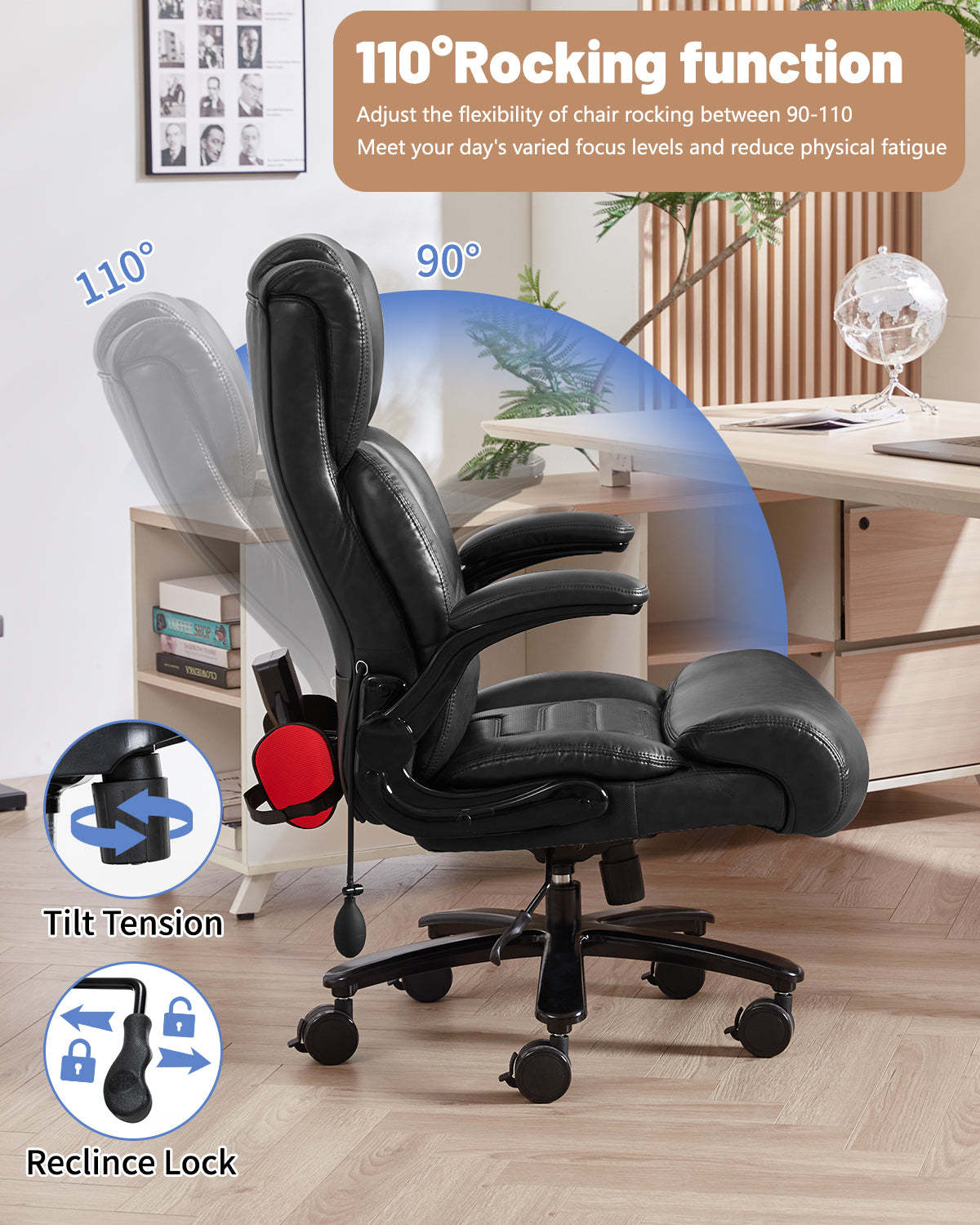 ?Multi-function Adjustment?This executive desk chair offers a smooth rocking motion between 90 and 115 with adjustable pressure, allowing you to tailor the movement to your preference. Easily modify the seat height to keep your muscles engaged, reducing stiffness and preventing pain throughout the day.