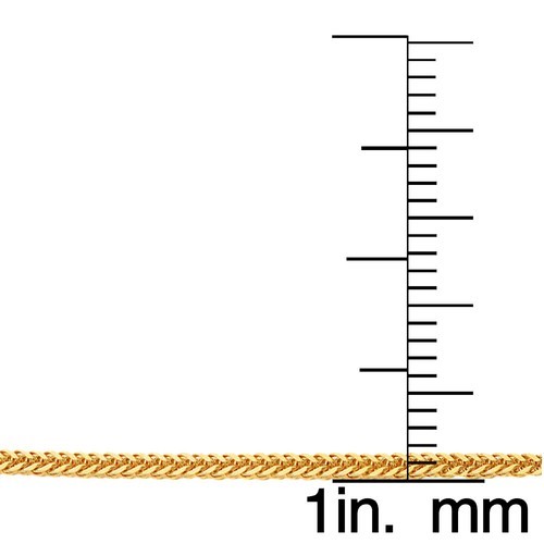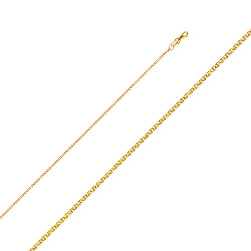 The necklace is completed with a matching 14k yellow gold flat wheat chain, available in lengths ranging from 16 to 24 inches. Each length offers a different weight, with the 16-inch chain weighing approximately 1.52 grams and the 24-inch chain around 2.09 grams. Secured by a reliable lobster claw clasp, this necklace combines grace and durability.