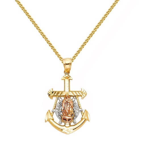 Genuine 14k Tri-Tone Gold 1.10" Anchor Guadalupe Pendant Necklace 16" to 24"
