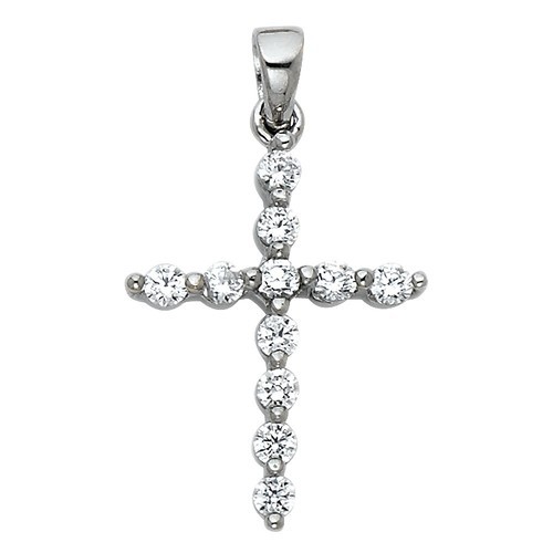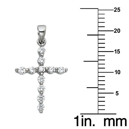 This beautiful cross pendant is an ideal gift for those who hold their faith dear. Made from 14-karat white gold, it features an exquisite arrangement of round-cut cubic zirconia, providing a striking sparkle that catches the eye. The pendant has a delicate size, measuring 0.70 inches in length, making it a subtle yet meaningful piece of jewelry.