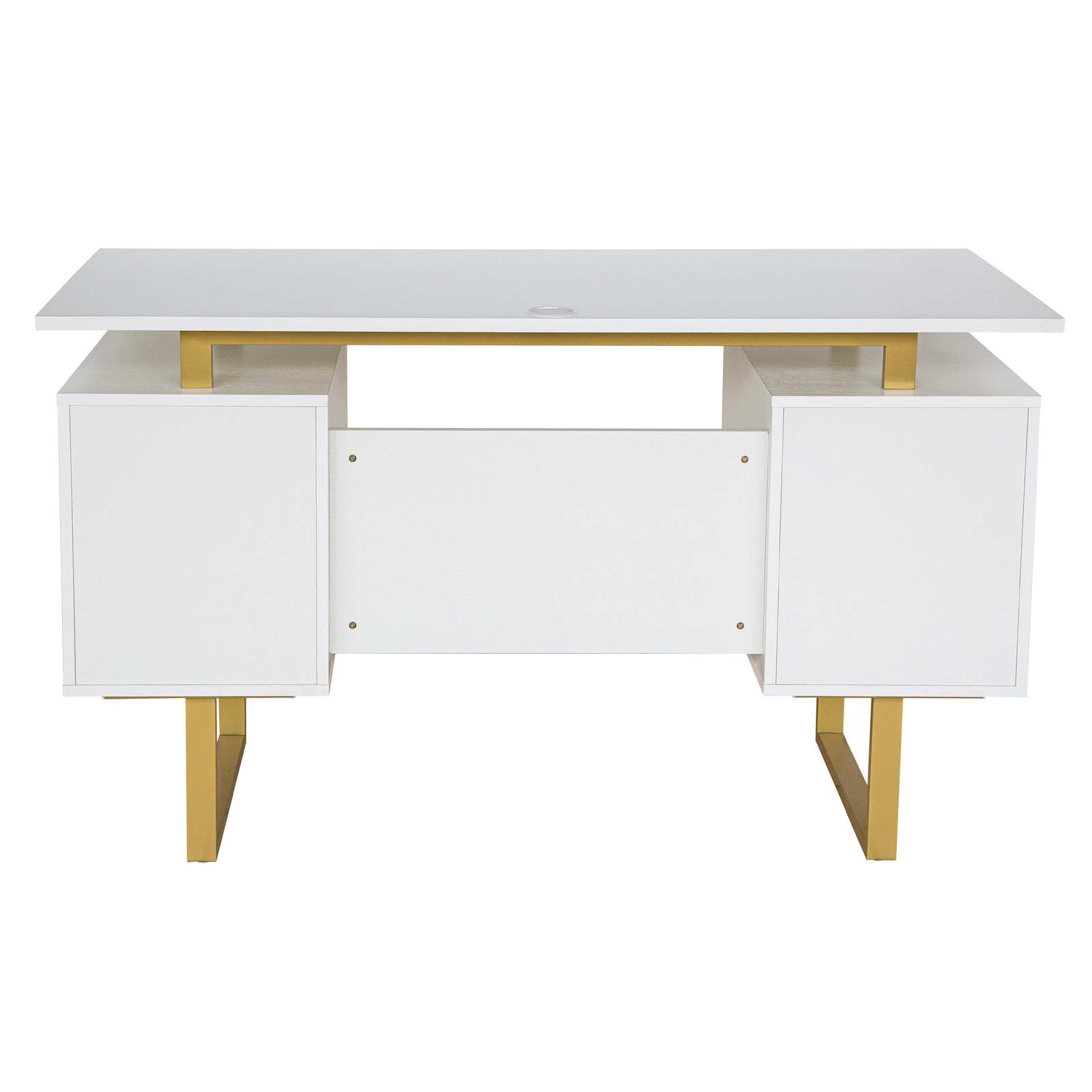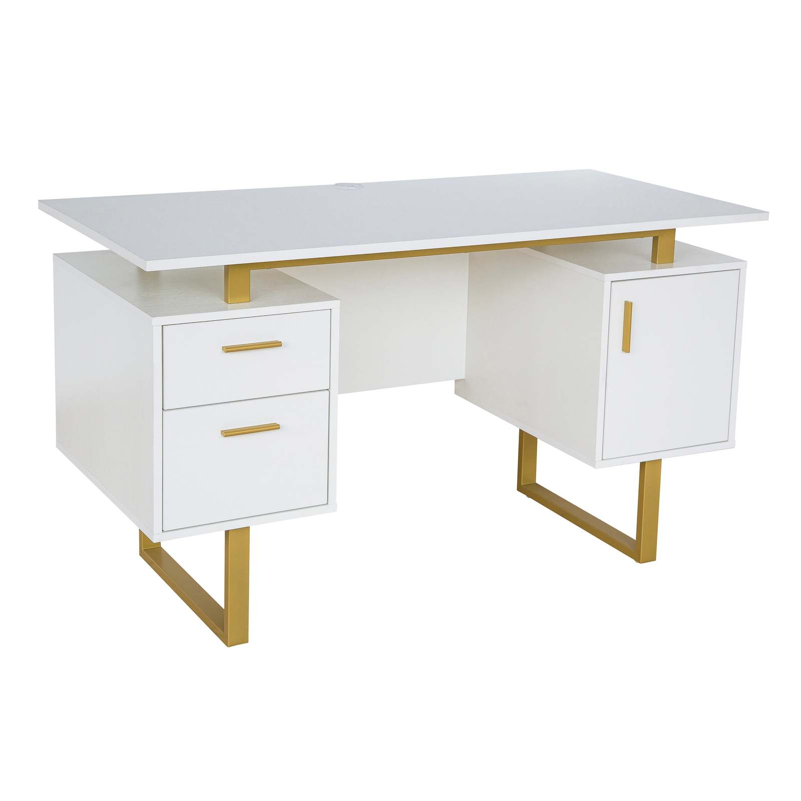 This white and gold modern desk features two siding drawers and a cabinet with gold handles, to provide functional space to keep your workspace organized.