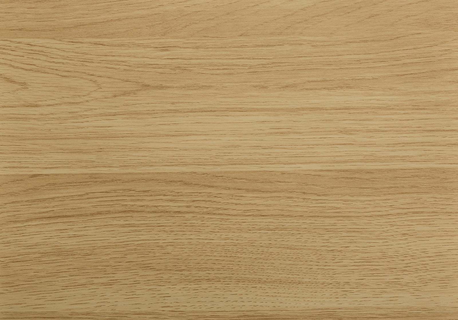 Solid rectangular corner desktop and 2 shelves in 2 different sizes are finished in a natural laminate with a smooth wood texture