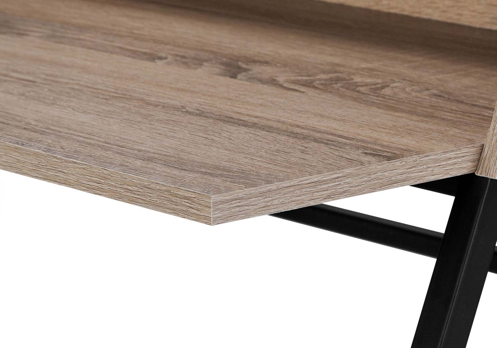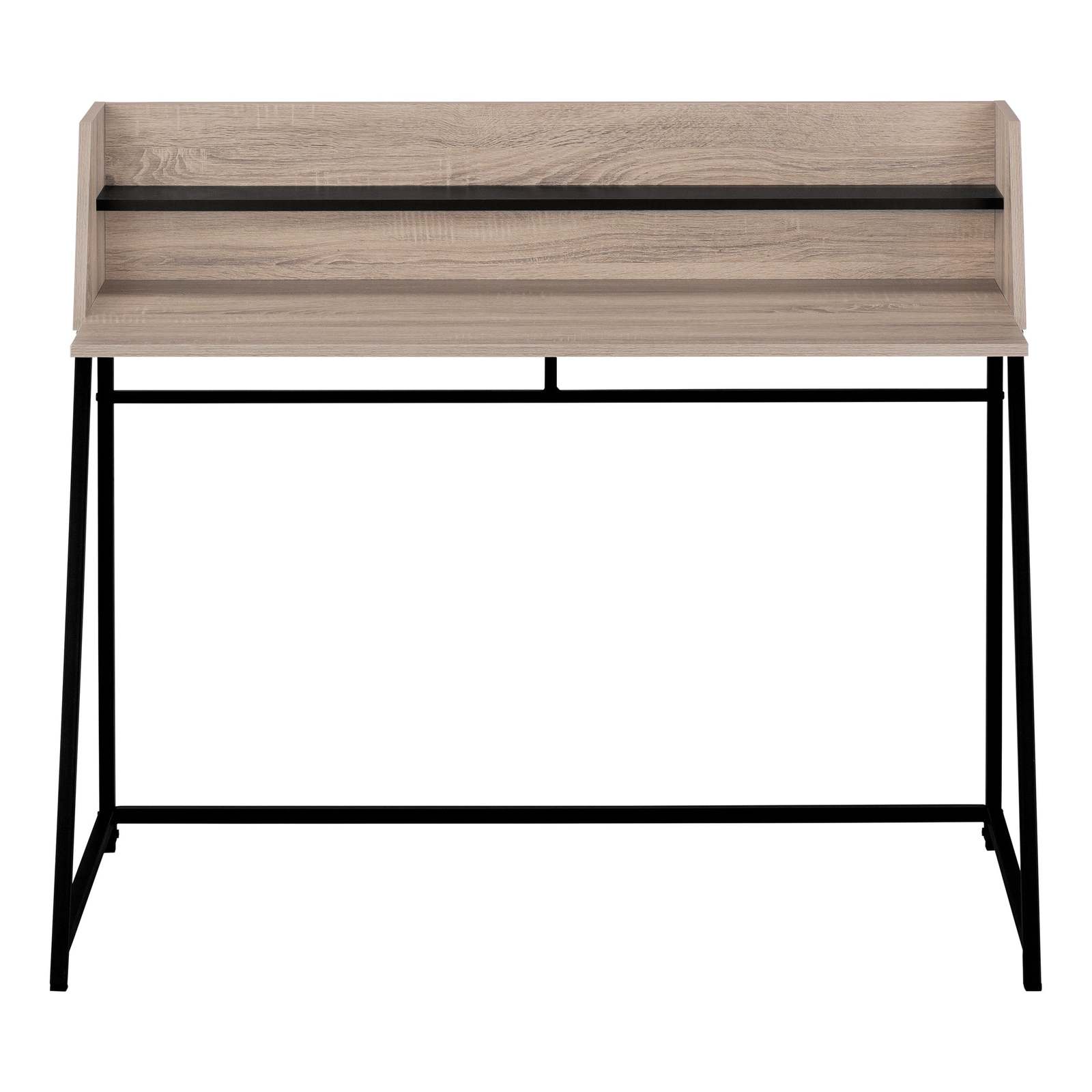 Computer desk in a dark taupe wood-look finish featuring a small hutch with 1 long shelf in a black finish