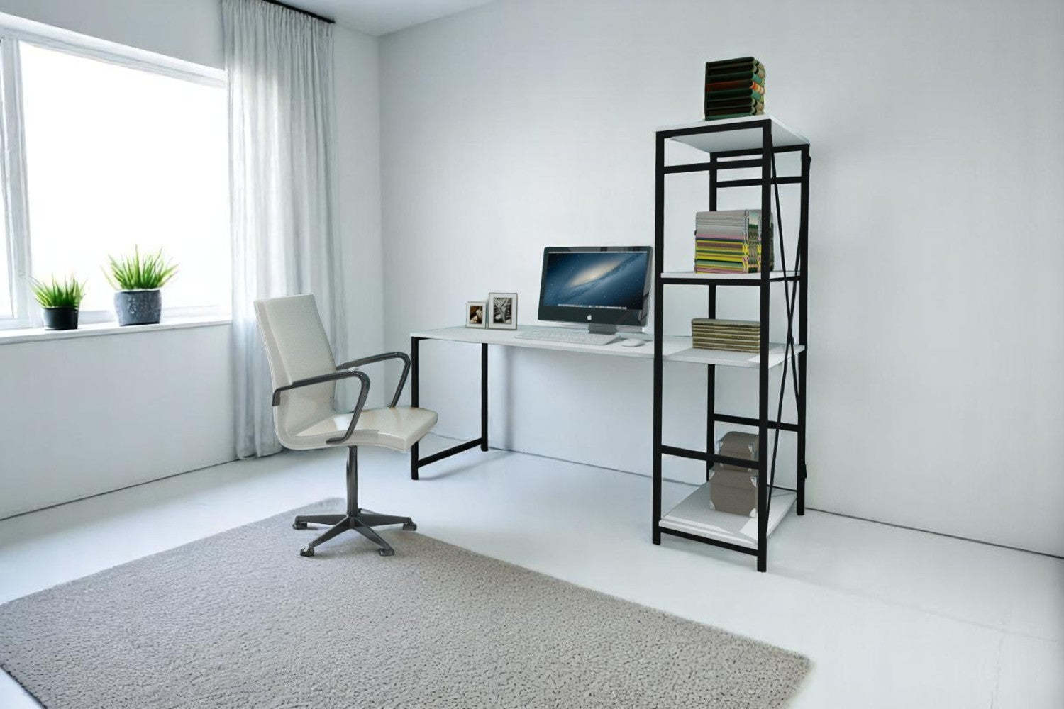 The integrated shelving unit provides ample space for books, files, and decor, helping you stay organized and focused. Its spacious surface comfortably accommodates your computer, accessories, and workspace essentials. Designed with durability in mind, the desk is made from high-quality materials that ensure long-term use.