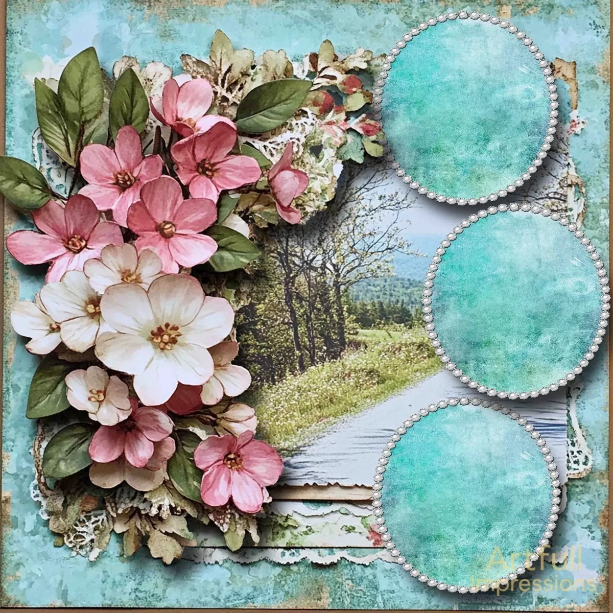and three round photo mats accented with pearl-trim detail on a soft teal