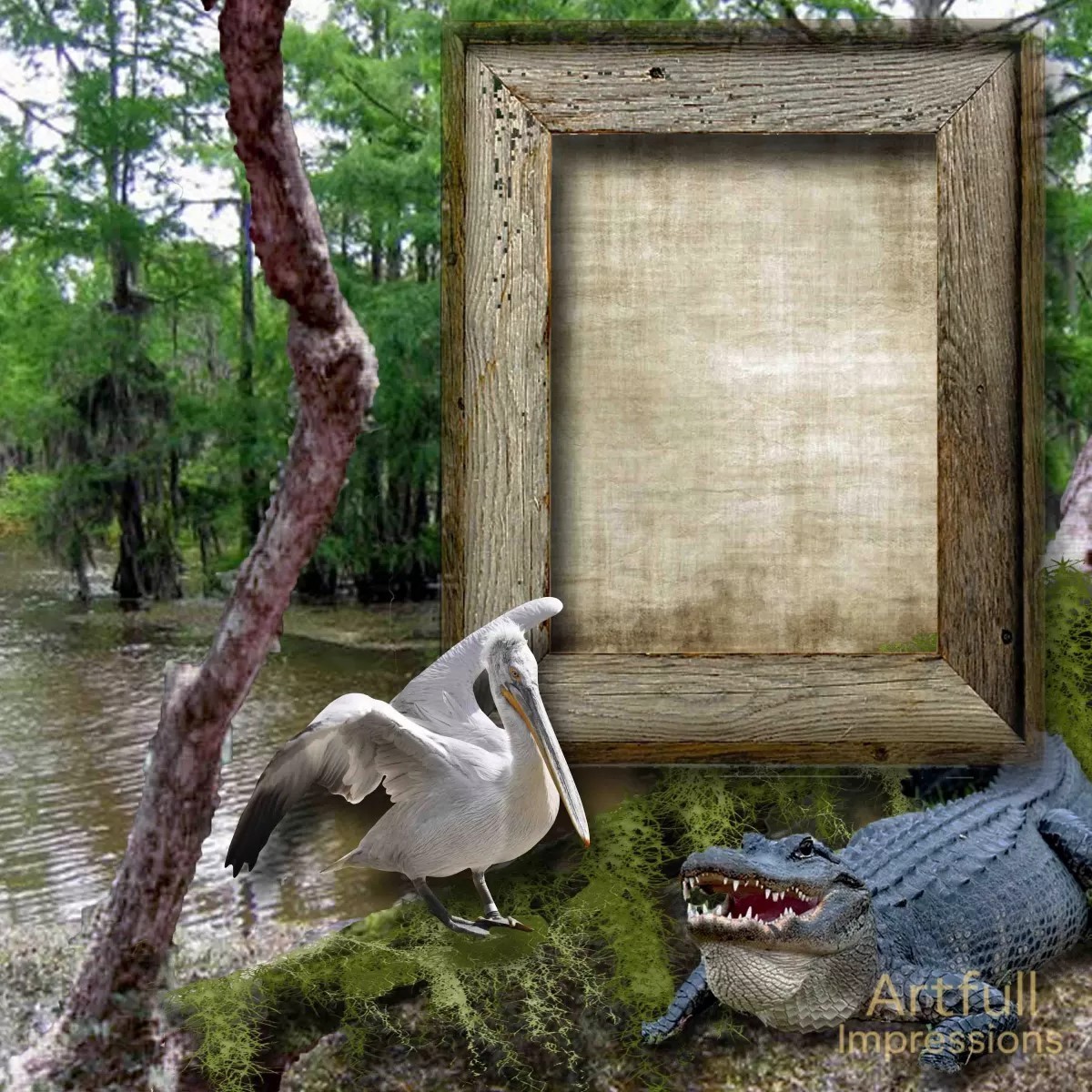 weathered wood-look frame, swampy moss, and wildlife accents make this an