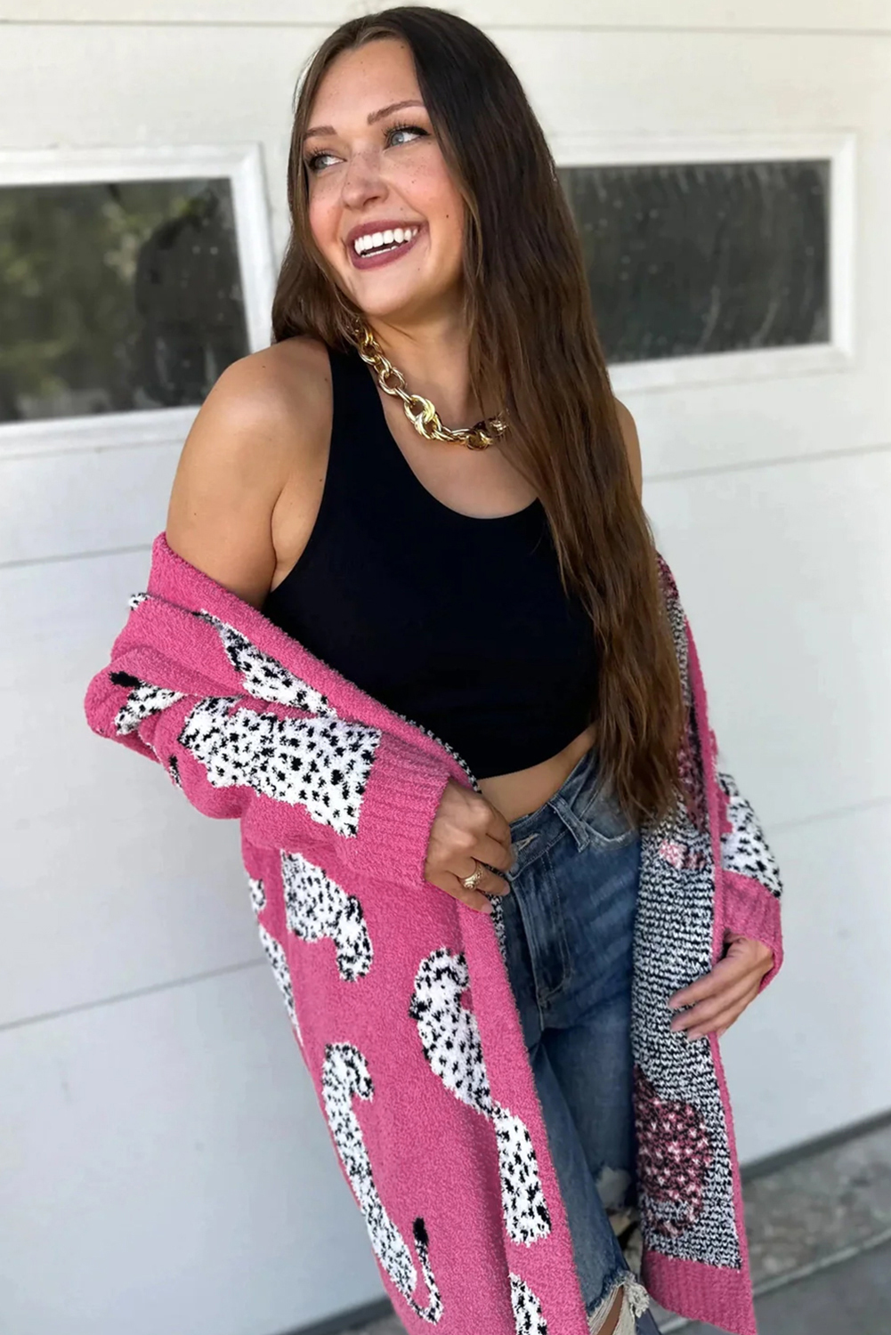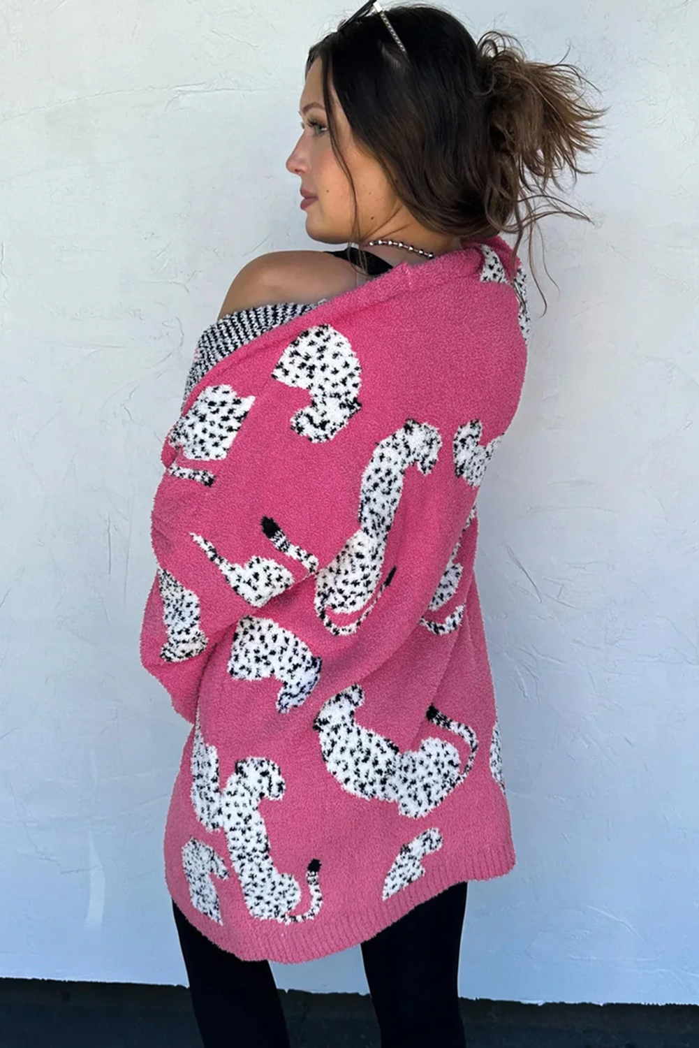 Rose Red Cheetah Pattern Open Front Knitted Cardigan