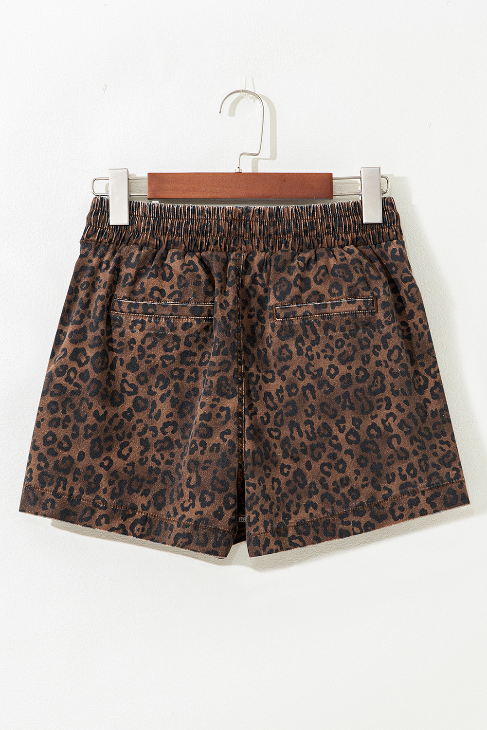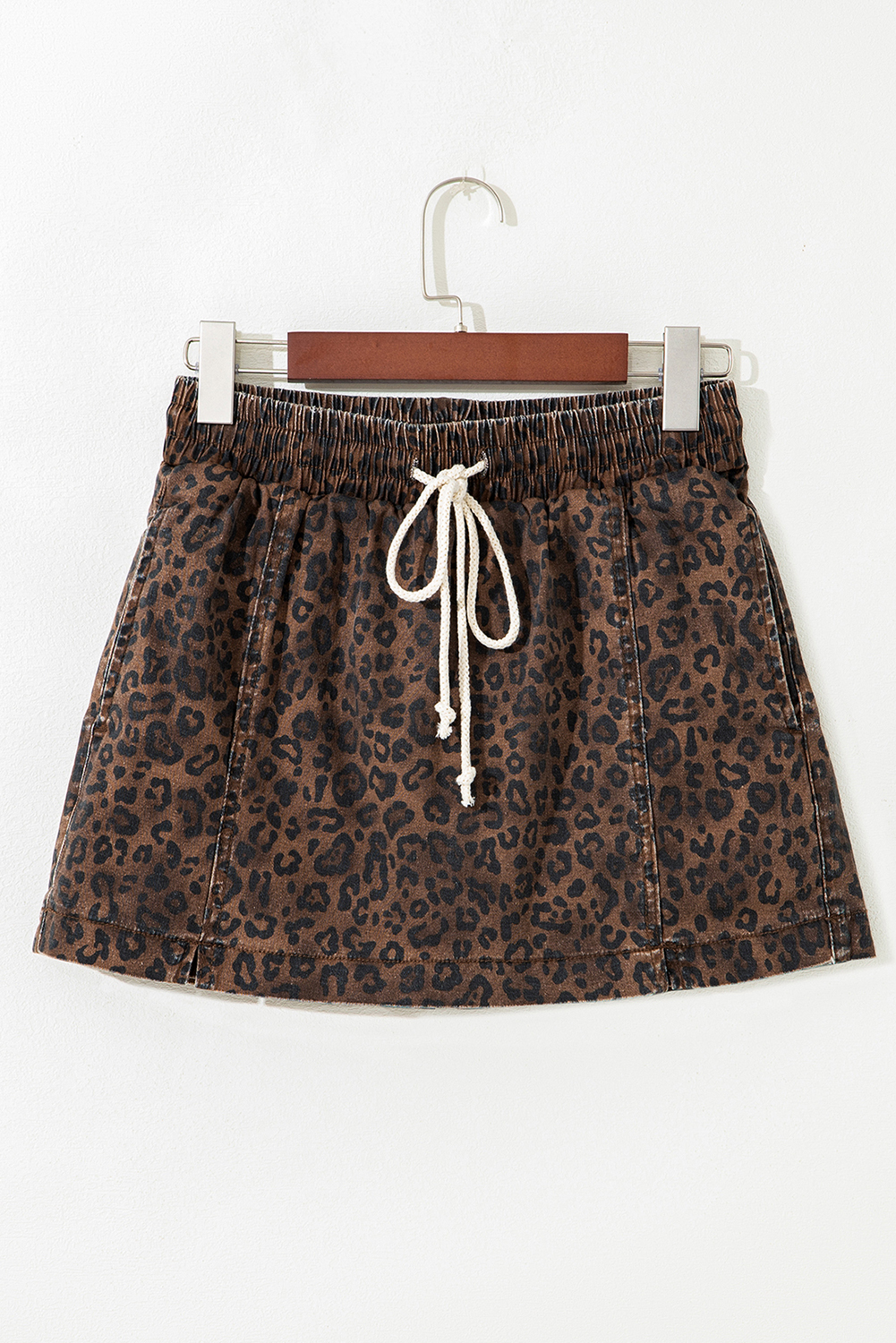 Brown Leopard Print Elastic Waistband Drawstring Denim Skort