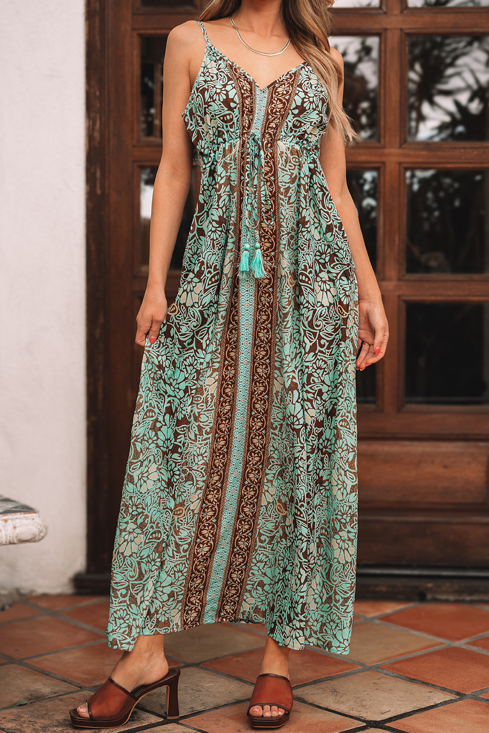 Green Floral Print V Neck Ruffled Trim Backless Tassel Waist Maxi Dress