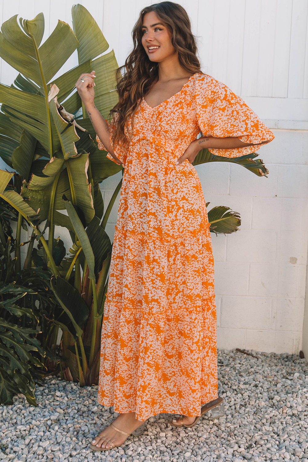 Orange Floral Print Split V Neck Tiered Maxi Dress