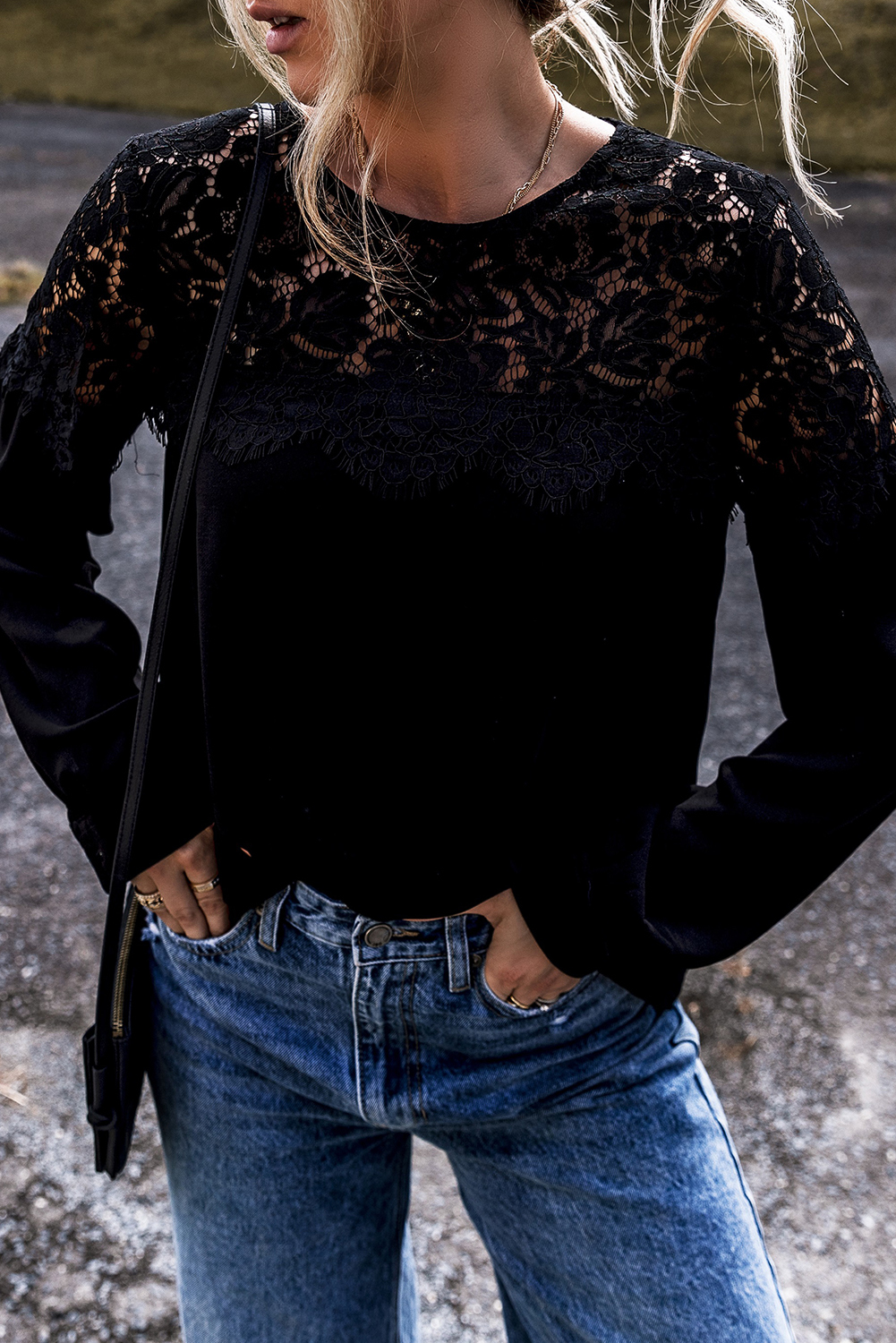 Black Lace Crochet Patchwork O Neck Long Sleeve Top