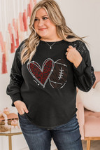 Black Rhinestone Heart Rugby Football Pattern Sequin Patched Sleeve Plus Size Top