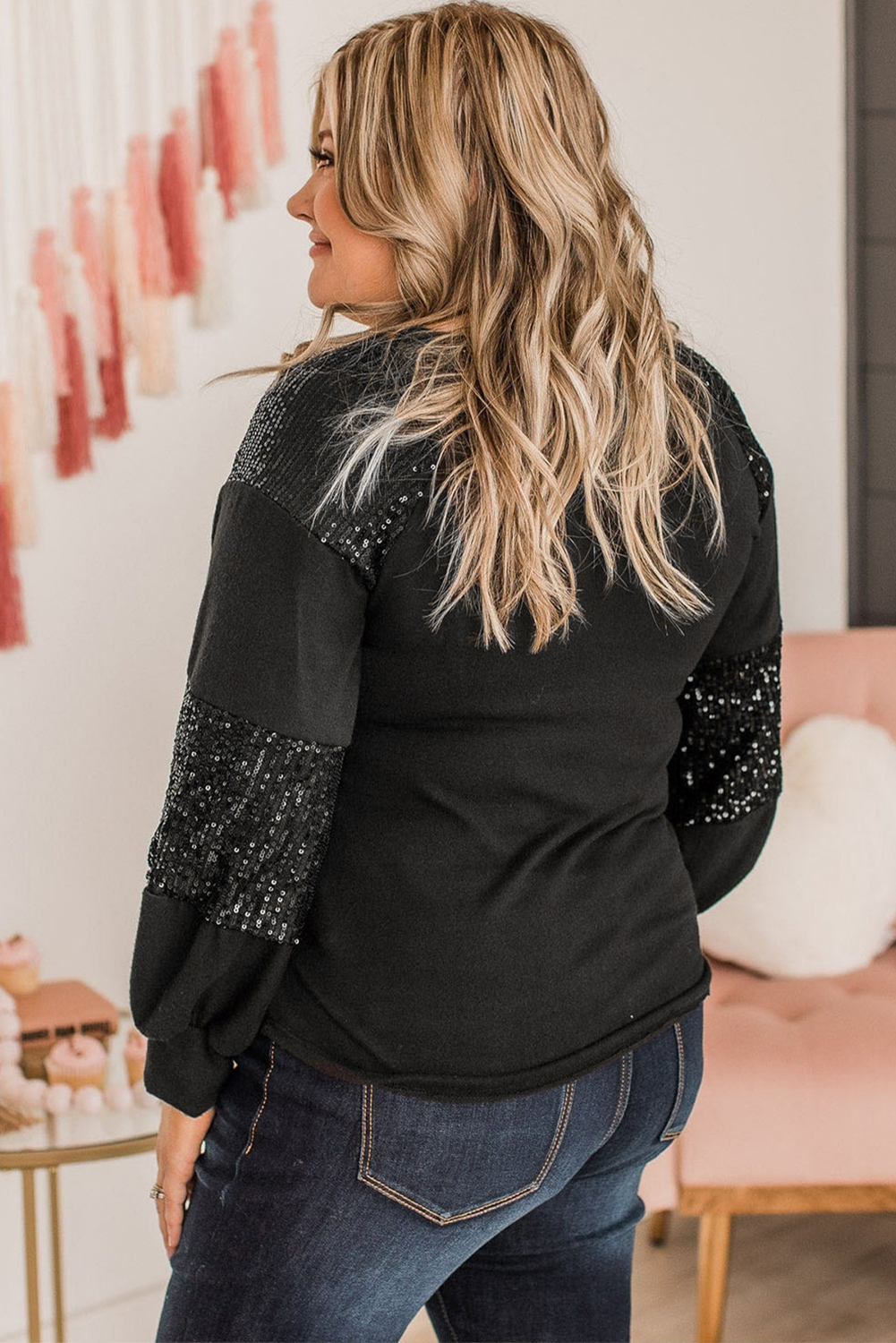 Black Sequin Contrast Long Sleeve Plus Size Top