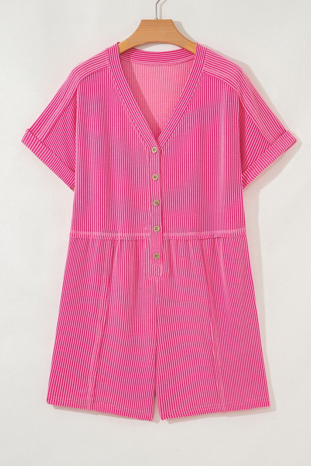 Bright Pink Spiral Ribbed Short Sleeve V Neck Buttoned Romper with Pocket