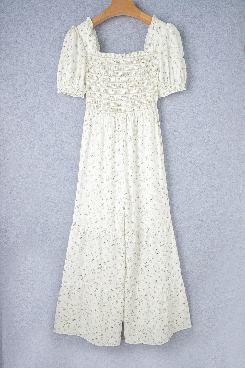 White Boho Floral Smocked Wide Leg Short Puff Sleeve Jumpsuit