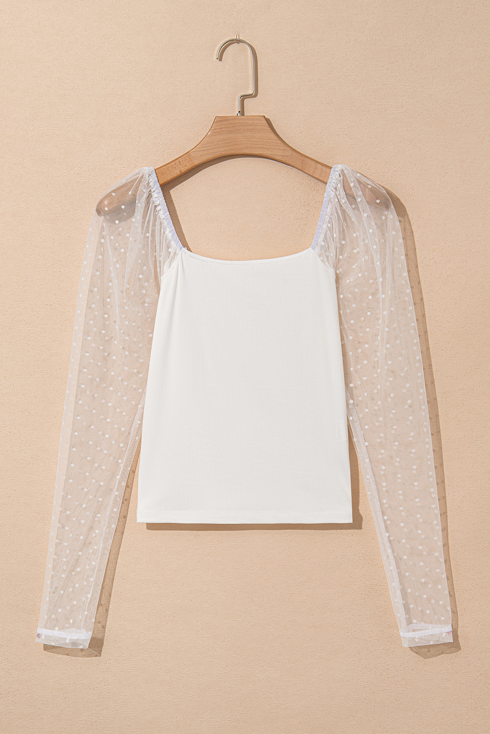 White Swiss Dot Mesh Long Sleeve Square Neck Slim Top