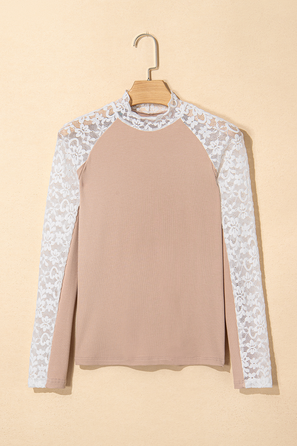 Beige Floral Lace Patchwork Long Sleeve High Neck ...