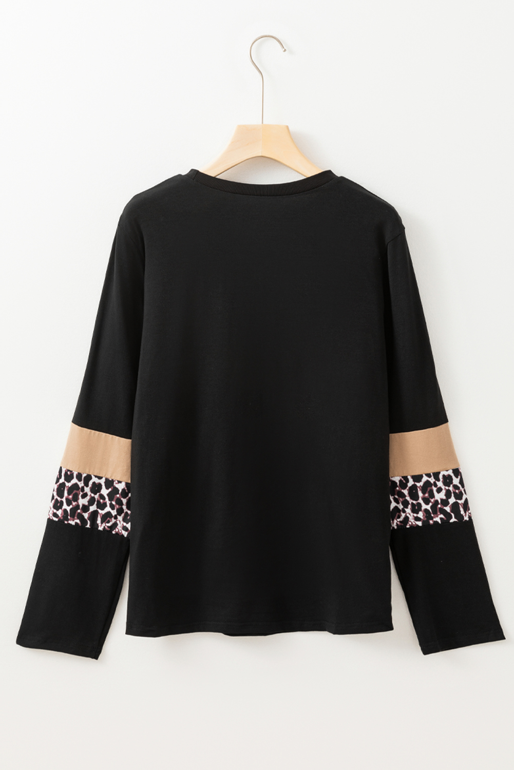 Brown Leopard Color Block Crewneck Long Sleeve Top