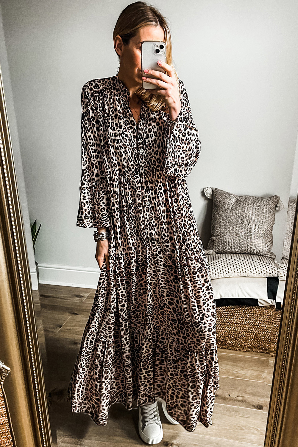 Apricot Leopard Print Tiered Wide Sleeve Maxi Dress