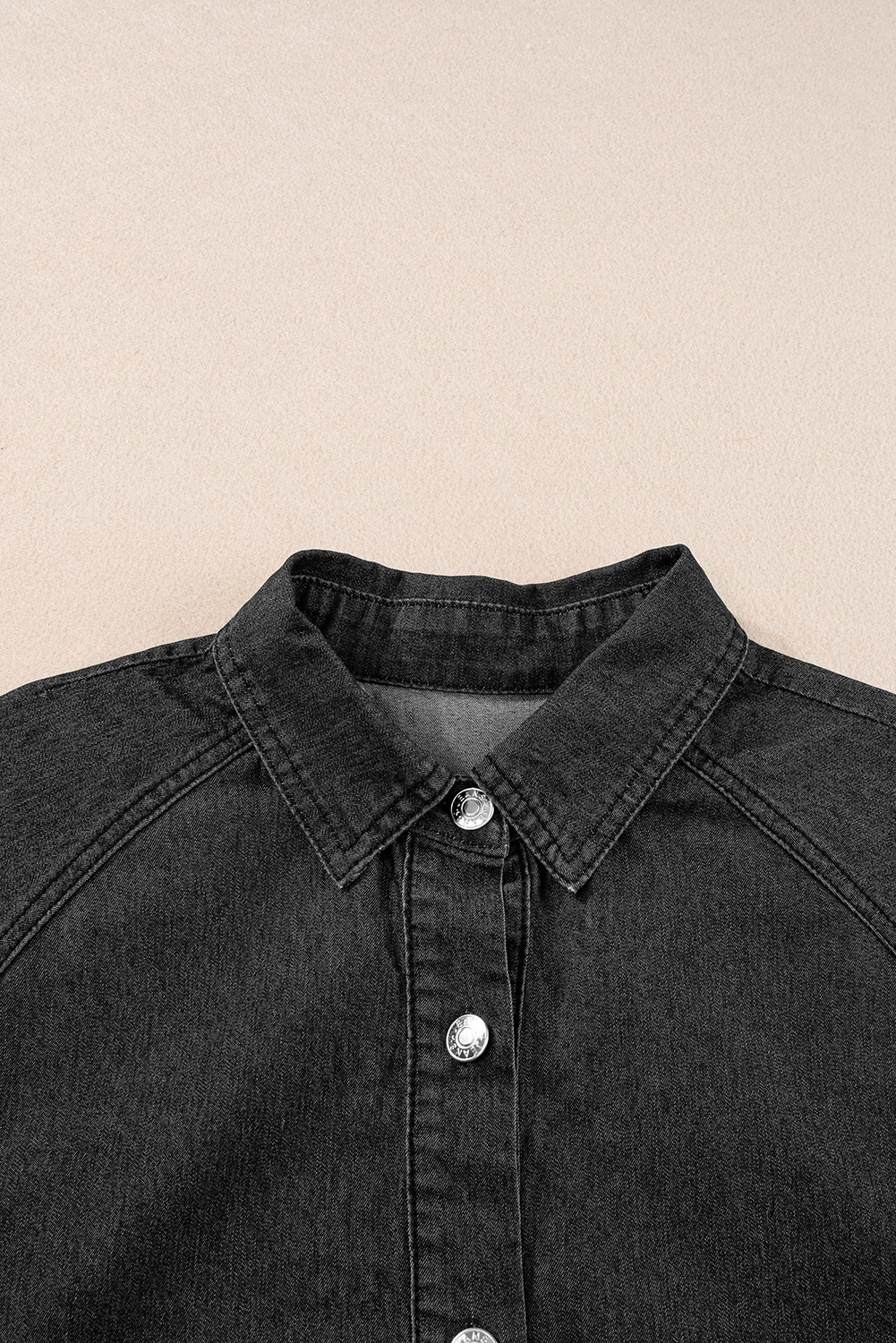 Black Frilled Short Sleeve Button Up Loose Denim Shirt Dress