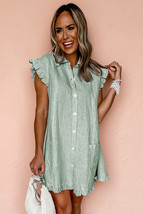 Green Stripe Frilled Sleeveless Collar Front Pocket Button Up Mini Dress
