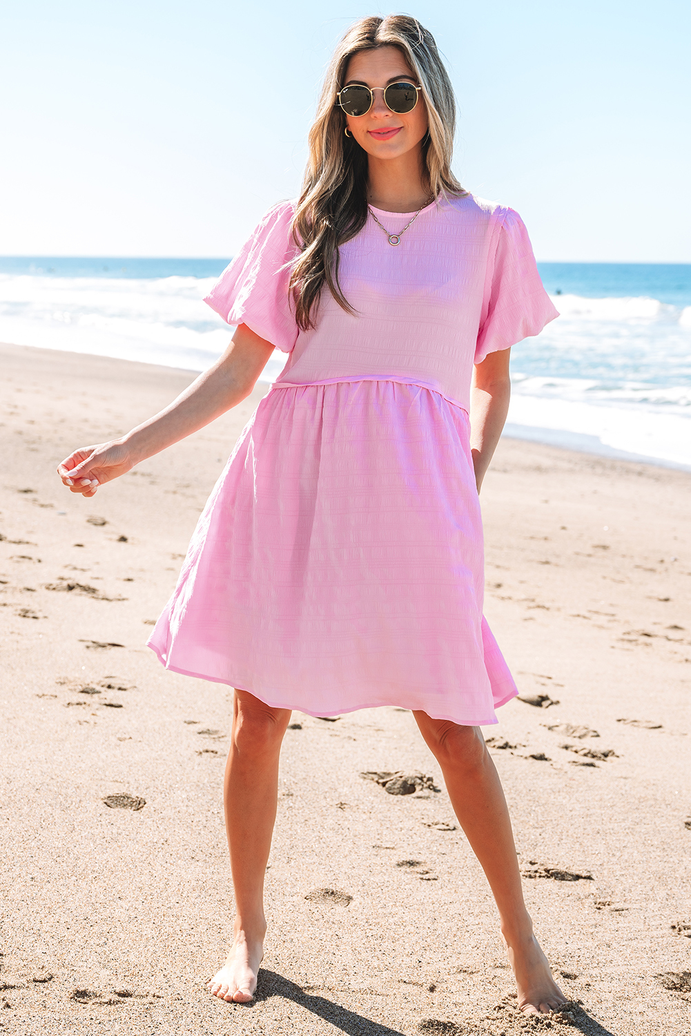 Rose Red Textured Ruffled Short Sleeve Mini Dress