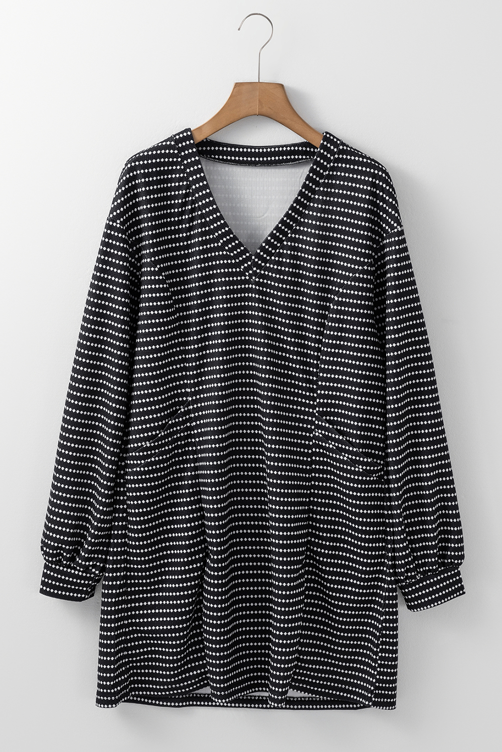 Black Stripe Collared V Neck Long Sleeve Loose Cas...