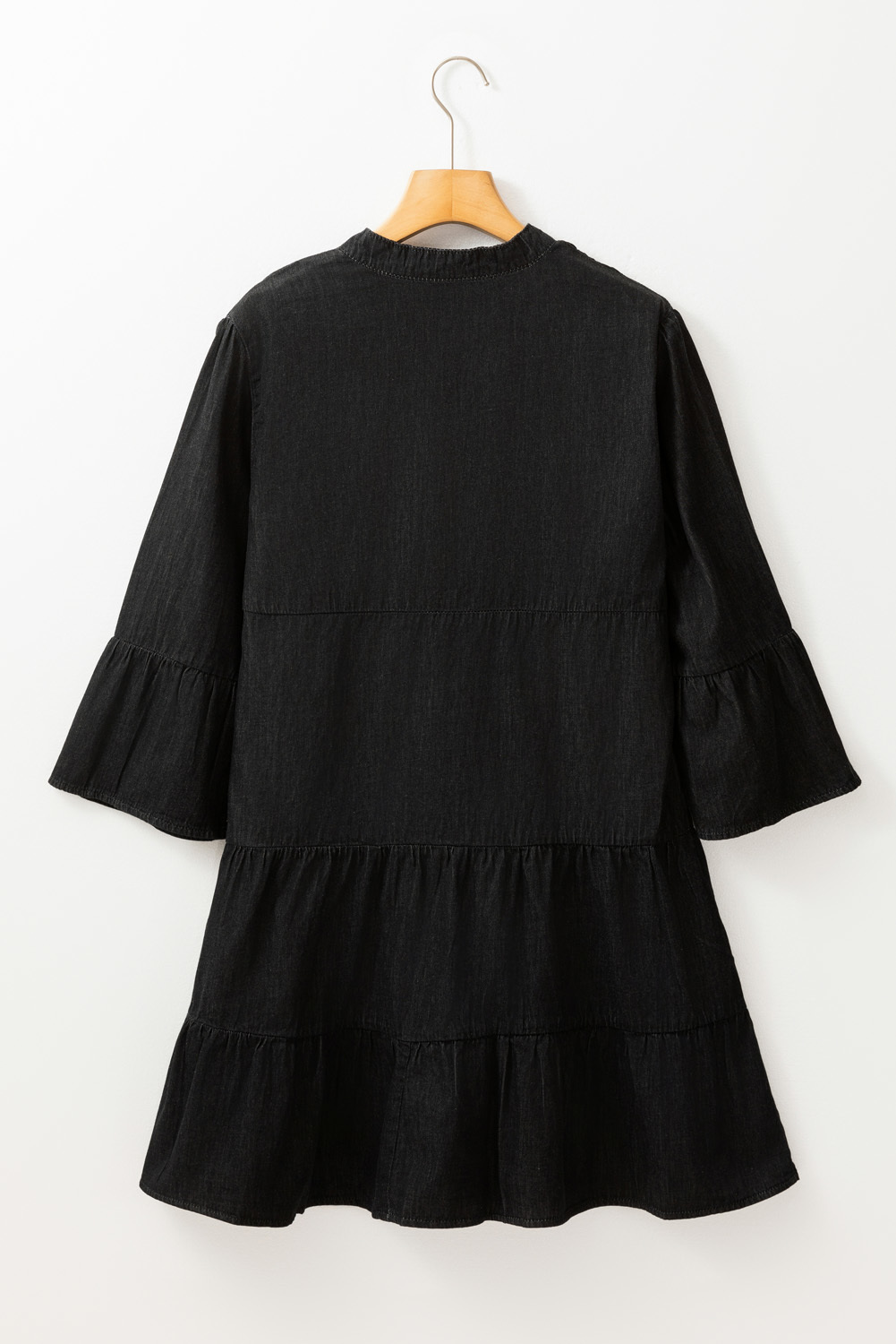 Black Chambray Ruffled 3/4 Sleeve Tiered Split V Neck Mini Dress