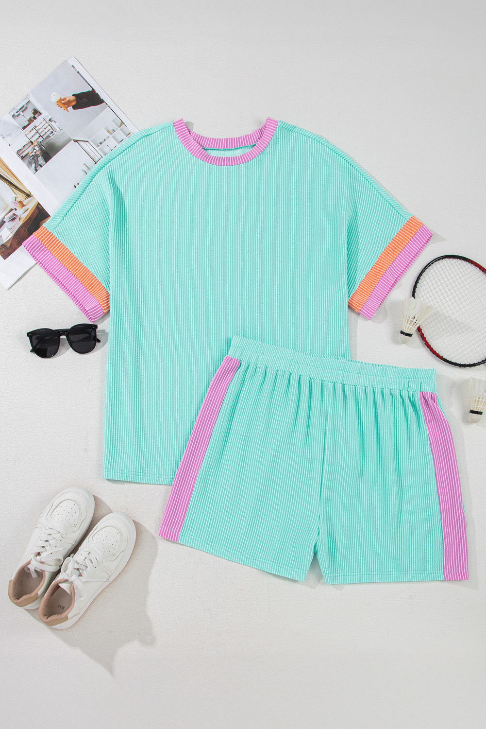 Light Blue Plus Size Color Block Corded Knit Tee and Shorts Set