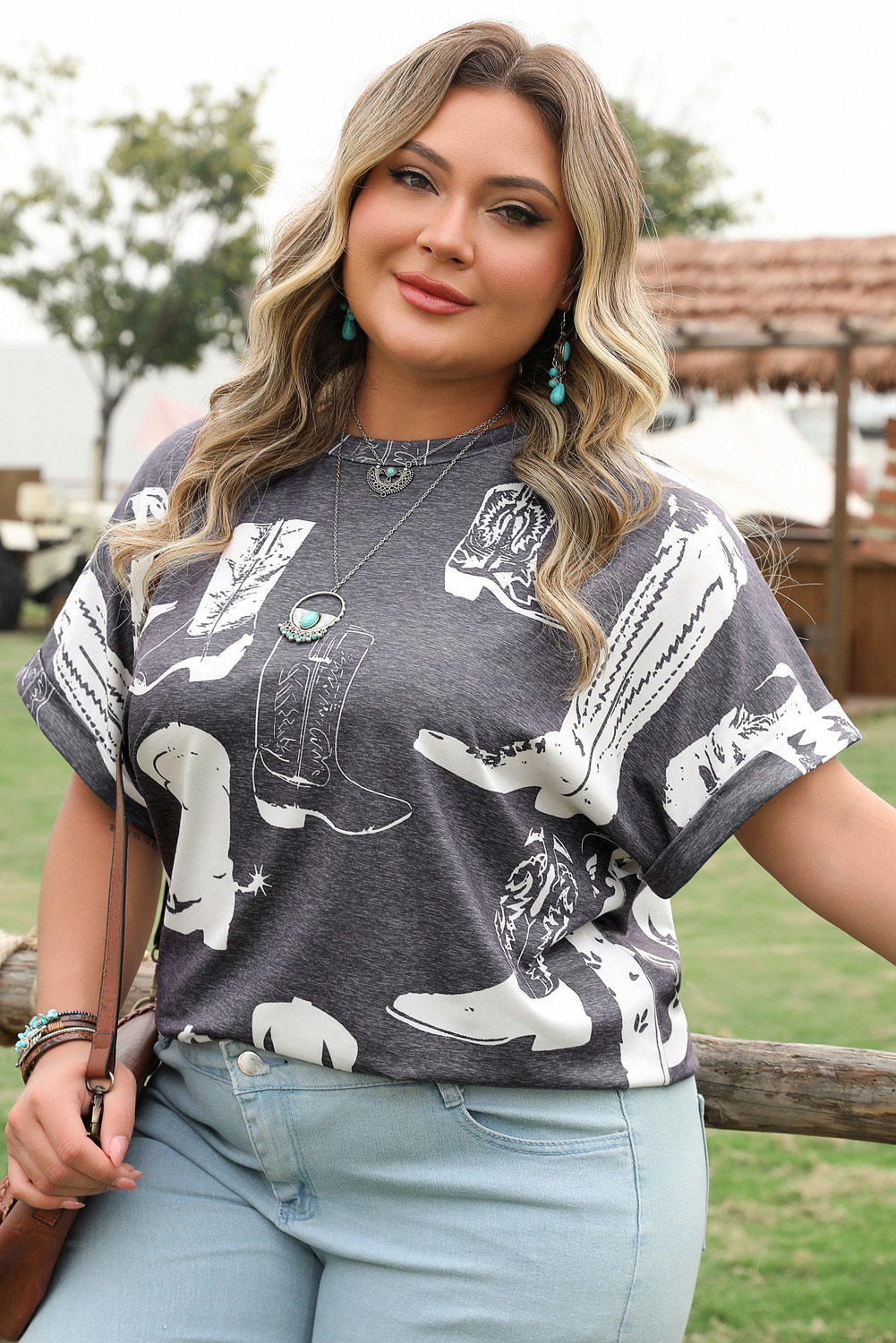 Gray Plus Size Western Boots Print Crew Neck T Shirt