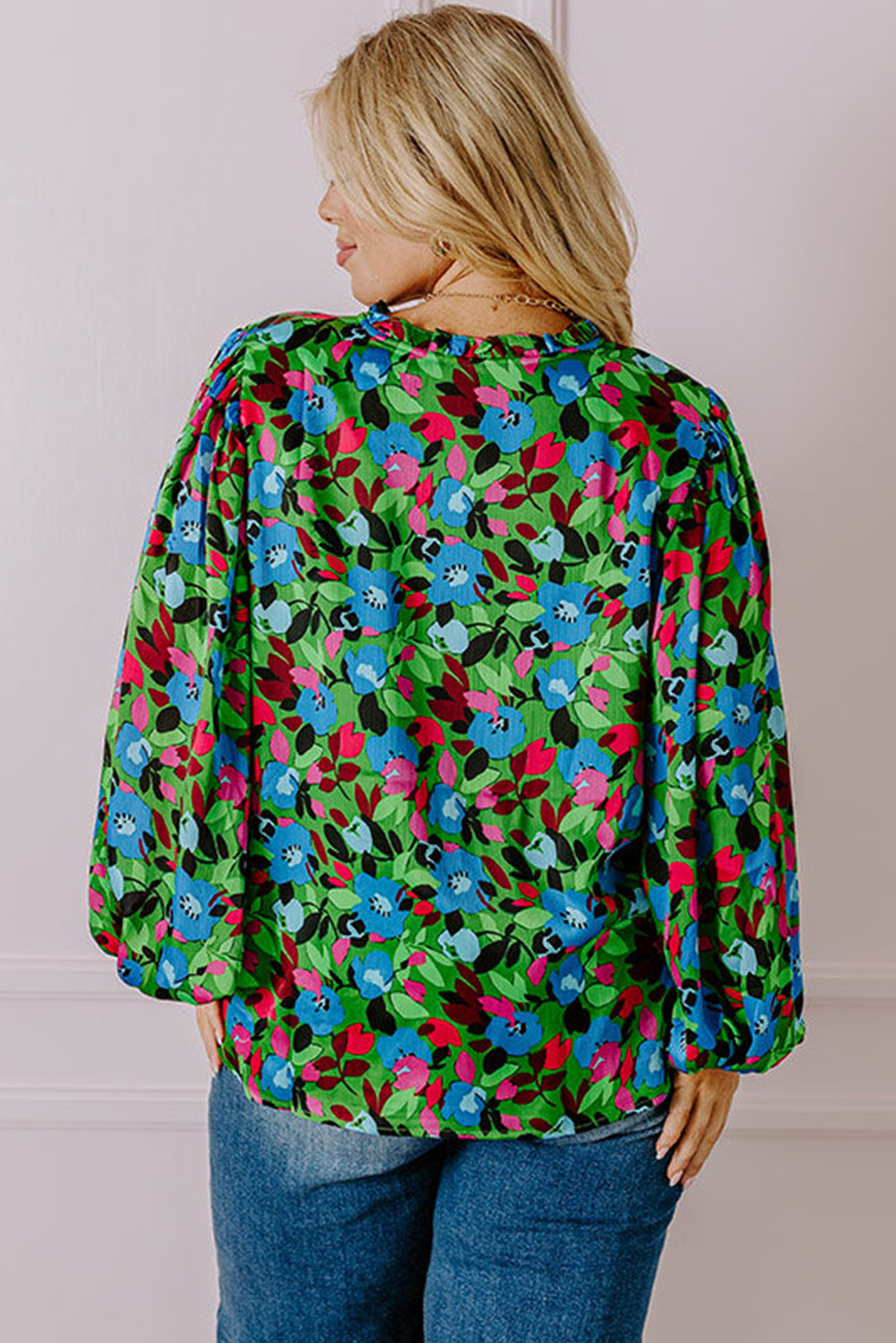 Green Plus Size Floral Bubble Sleeve V Neck Blouse