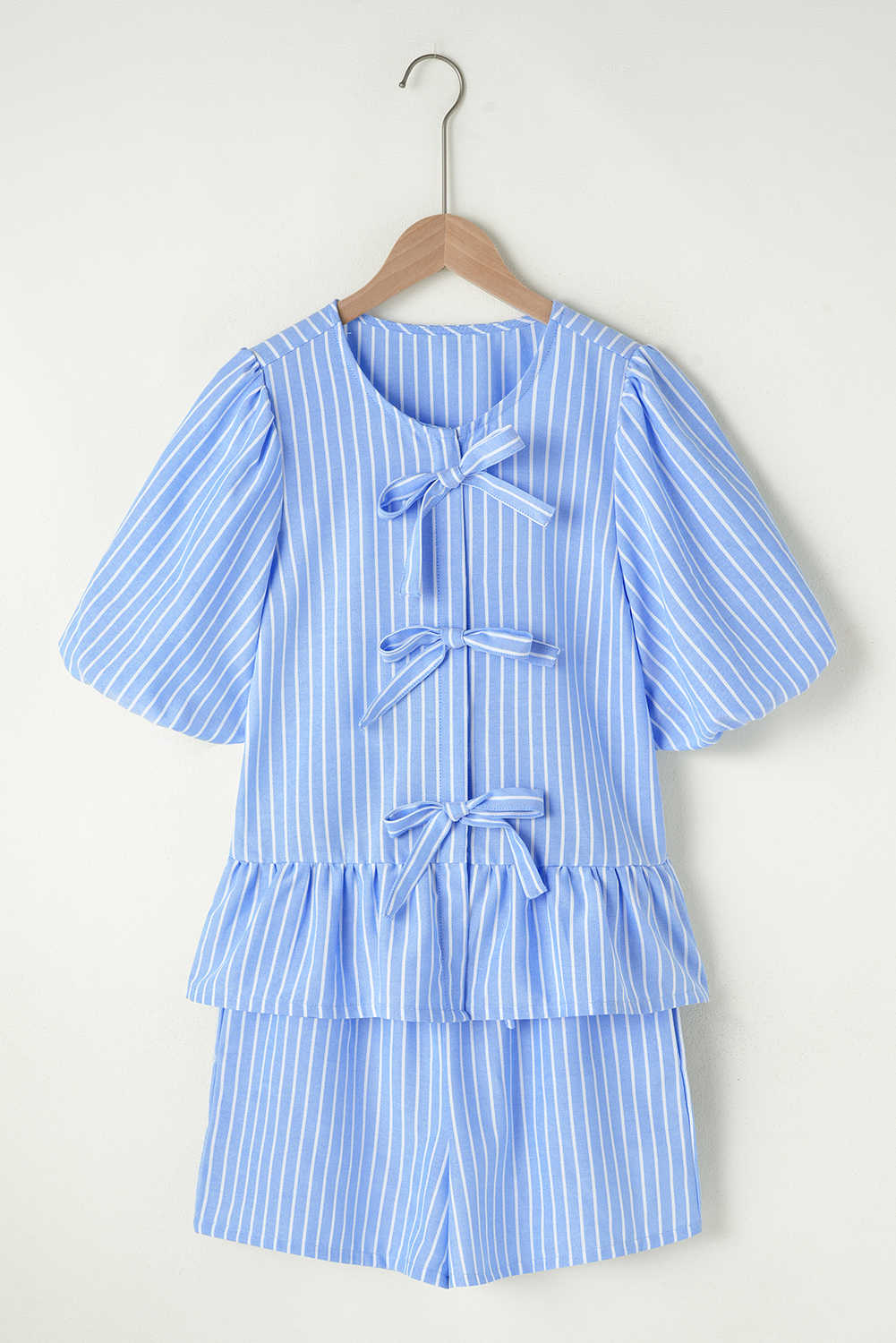 Sky Blue Striped Bowknot Detail Puffy Sleeve Top and Shorts 2Pcs Set