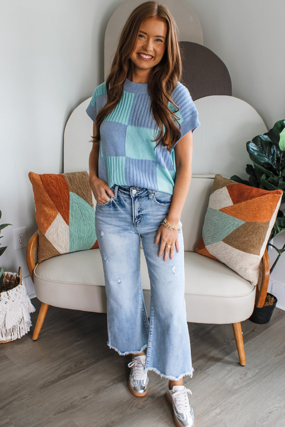 Light Blue Checkered Color Block Crew Neck Short Sleeve Sweater