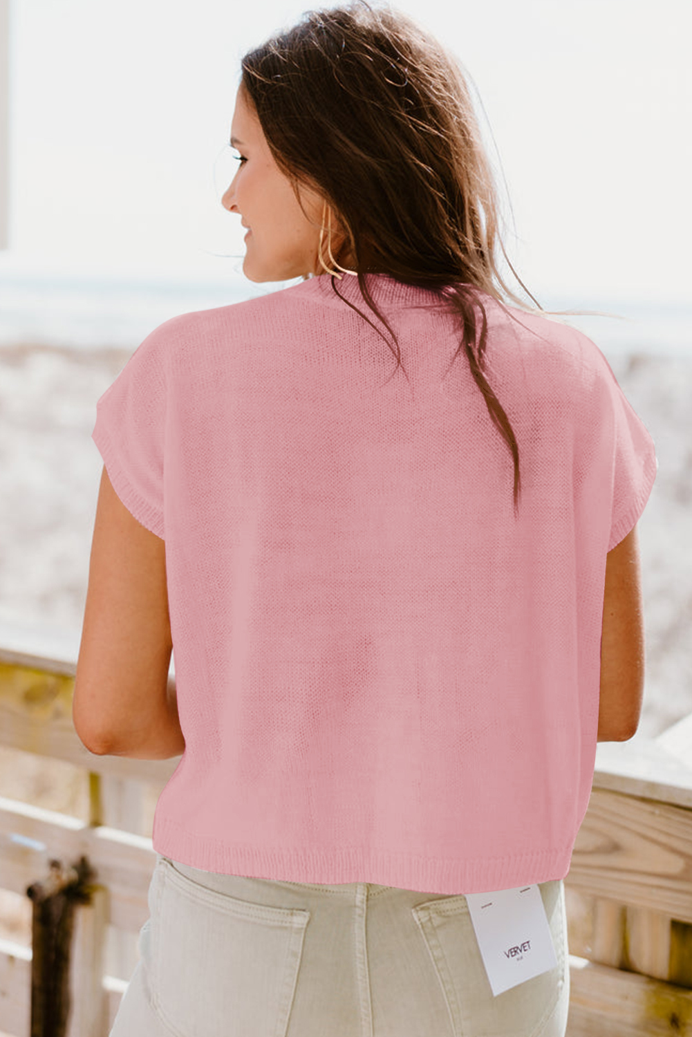 Pink Patch Pocket Ribbed Knit Short Sleeve Sweater