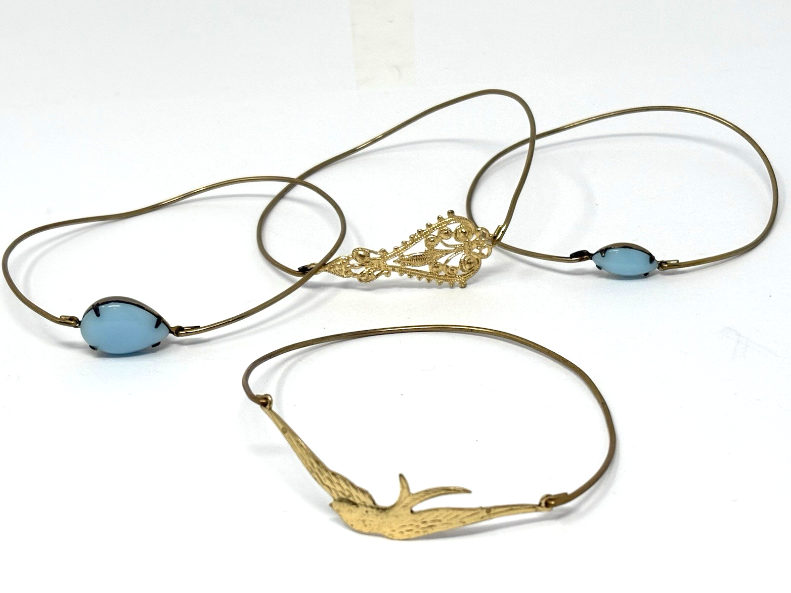 Two of the bangles have blue stones (unsure what the stone are made from). One of the bracelets has a filigree design and the other has a swallow bird design.