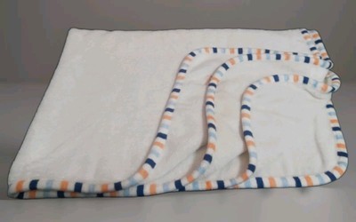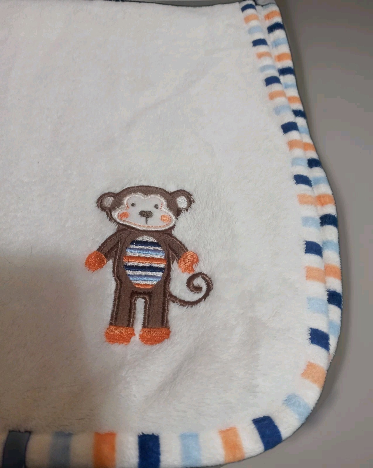 The Babies R Us Cream Monkey Orange Blue Stripe Trim Security Baby Blanket is a cozy and adorable security blanket designed for babies.