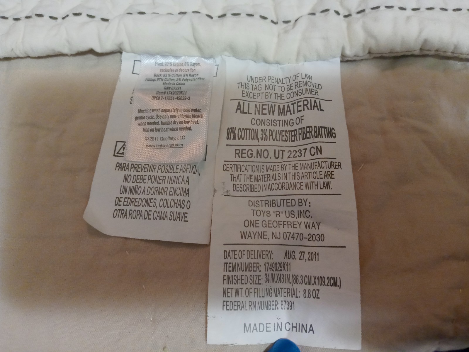 The Geoffrey Toys R Us Beige Tan Sheep Lamb Quilt Baby Blanket is a 34"x43" multi-purpose blanket made of cotton and polyester, featuring a beige and tan color scheme with a cute lamb and sheep theme.