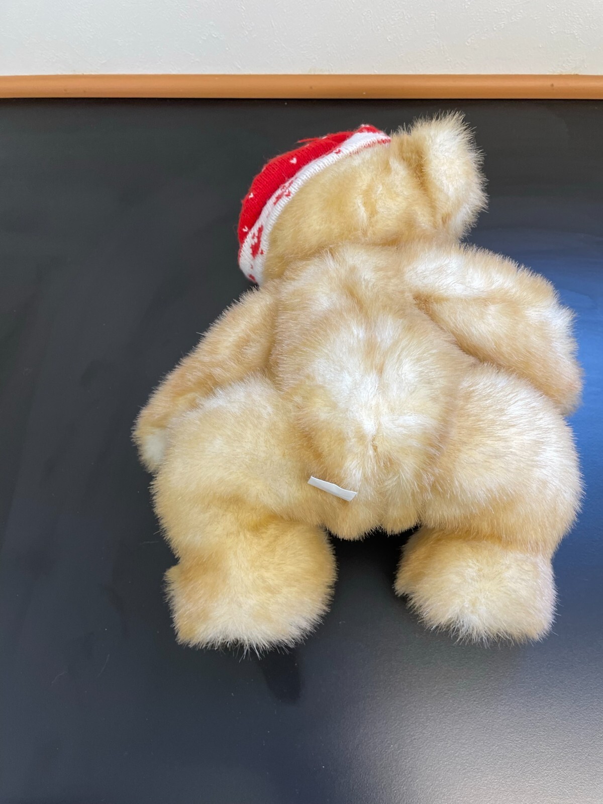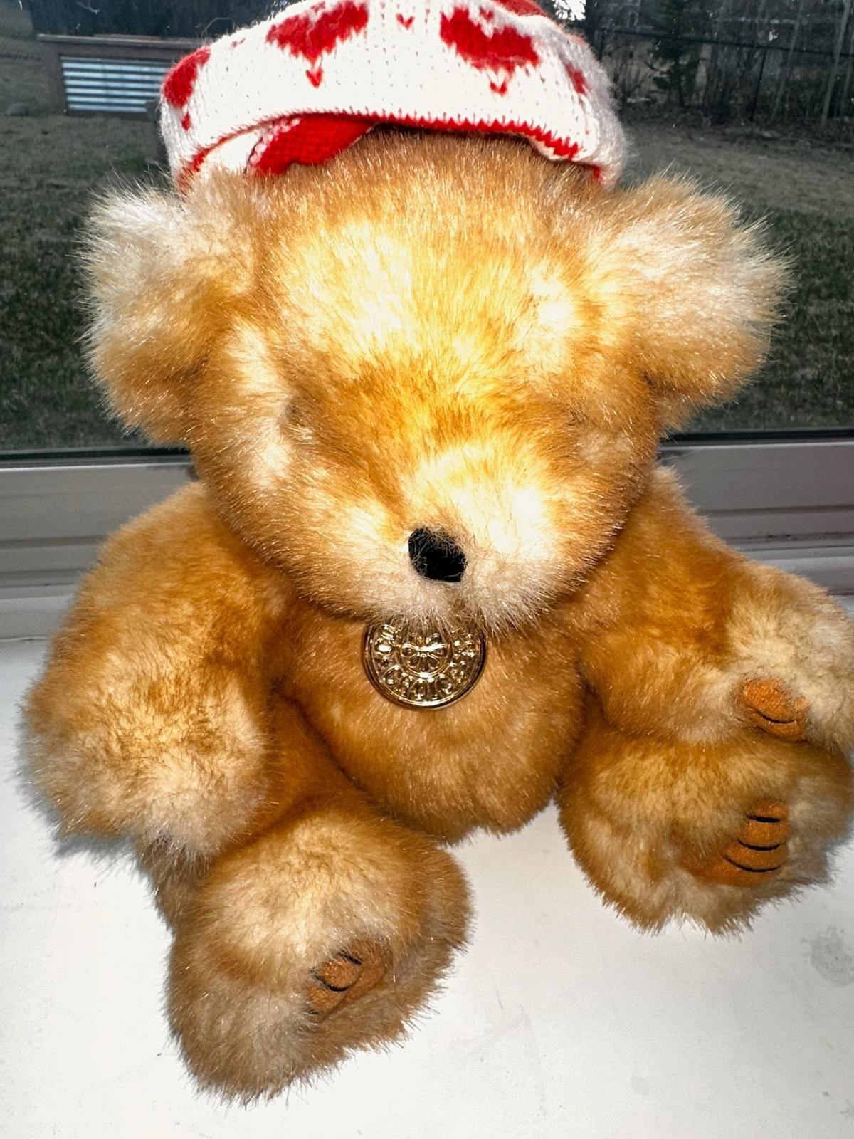 This adorable vintage plush teddy bear is a charming addition to any collection. It features a soft golden fur, a festive red and white knitted hat, and a gold-tone medal around its neck, adding a unique touch. Made with high-quality craftsmanship, this bear is in excellent preowned condition with no visible wear or damage. Perfect for display or as a gift for teddy bear enthusiasts!